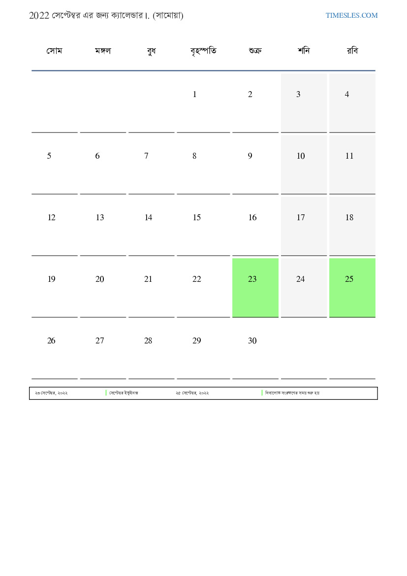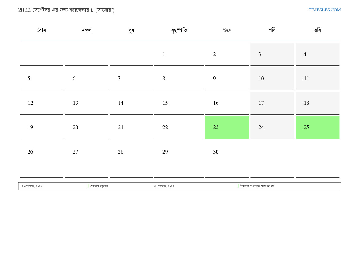 সামোয়া জন্য 2022 সেপ্টেম্বর এর জন্য ছুটির দিন এবং সপ্তাহান্তের ক্যালেন্ডার
