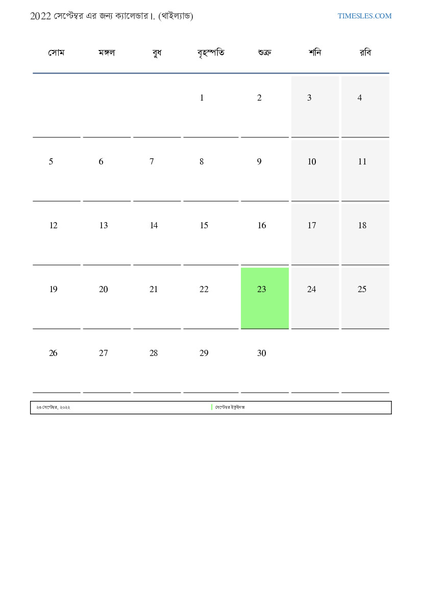 সেপ্টেম্বর মাসে 30 দিন রয়েছে। এটি 2022 এর 9 মাস | বছরের মরসুম: শরত। সেপ্টেম্বর মাস বৃহস্পতিবার থেকে শুরু হয়ে শুক্রবার শেষ হয়। 2022 সেপ্টেম্বর মাসে, থাইল্যান্ডে ১ ছুটি এবং দিন ছুটি রয়েছে।