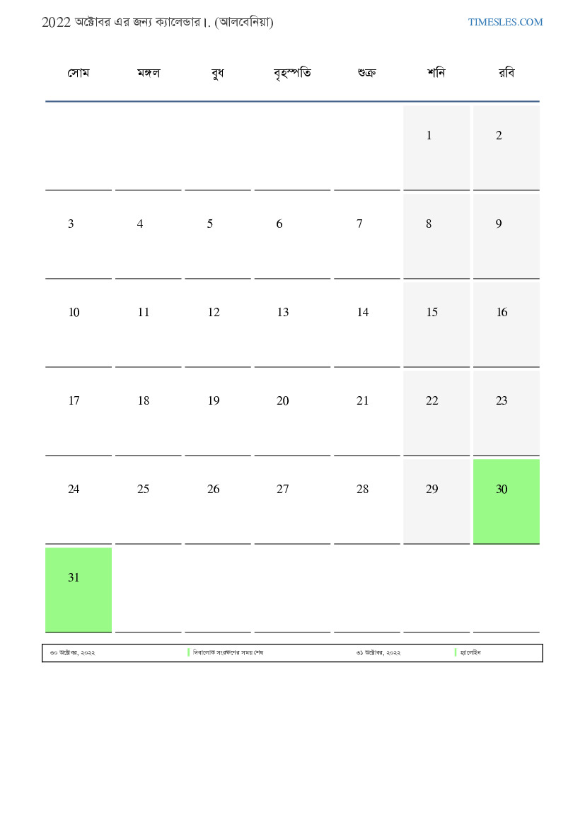আলবেনিয়ার জন্য 2022 অক্টোবর এর জন্য ছুটির দিন এবং সপ্তাহান্তের ক্যালেন্ডার
