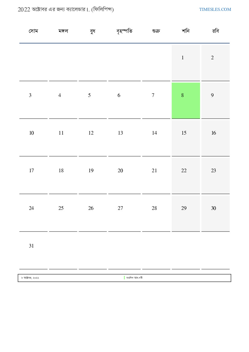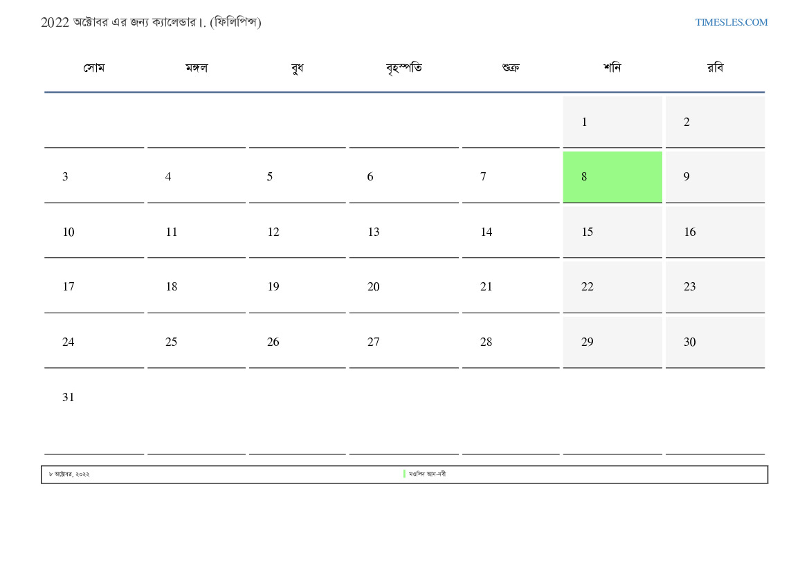 ফিলিপাইন জন্য 2022 অক্টোবর এর জন্য ছুটির দিন এবং সপ্তাহান্তের ক্যালেন্ডার