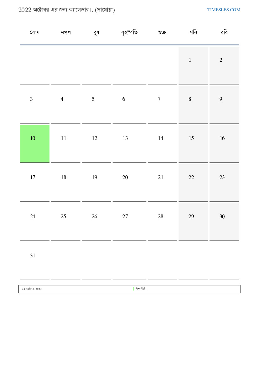 সামোয়া জন্য 2022 অক্টোবর এর জন্য ছুটির দিন এবং সপ্তাহান্তের ক্যালেন্ডার