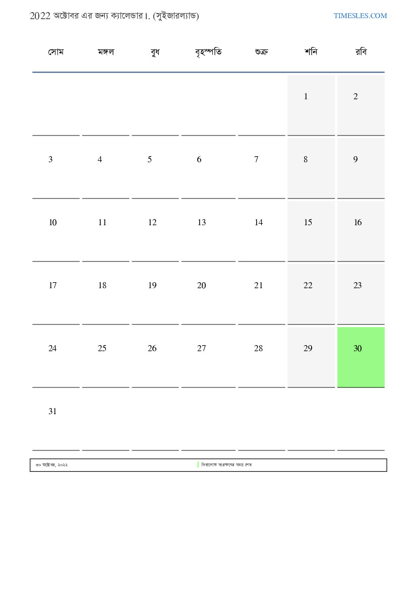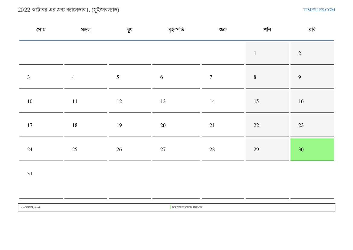 সুইজারল্যান্ডের জন্য 2022 অক্টোবর এর জন্য ছুটির দিন এবং সপ্তাহান্তের ক্যালেন্ডার