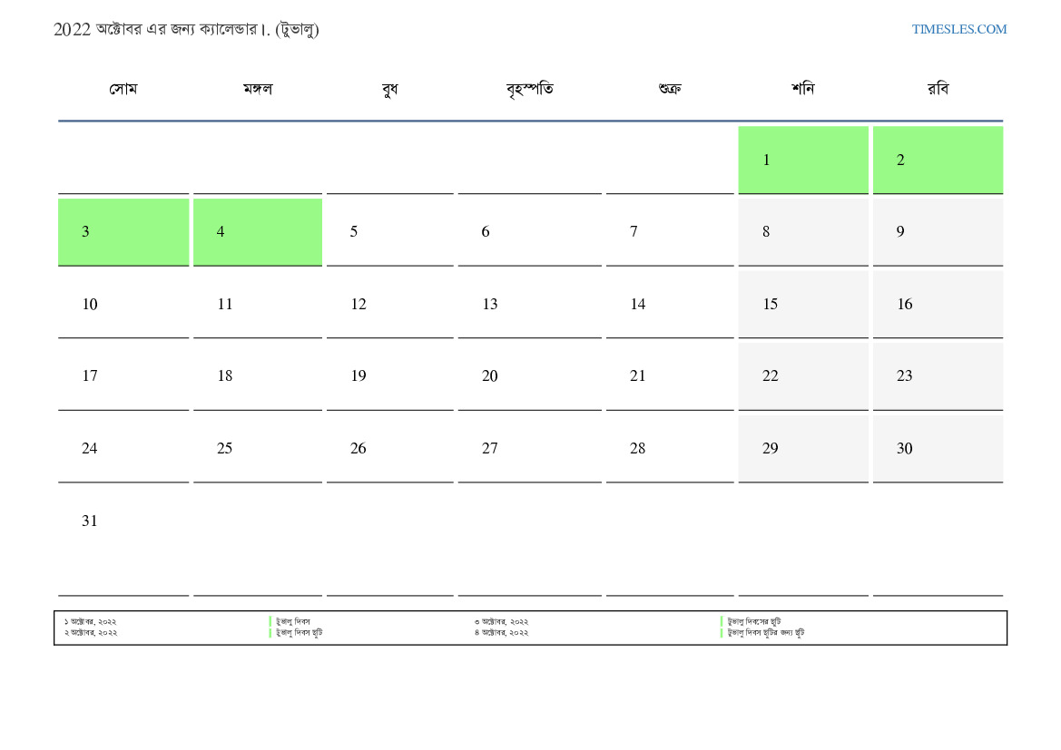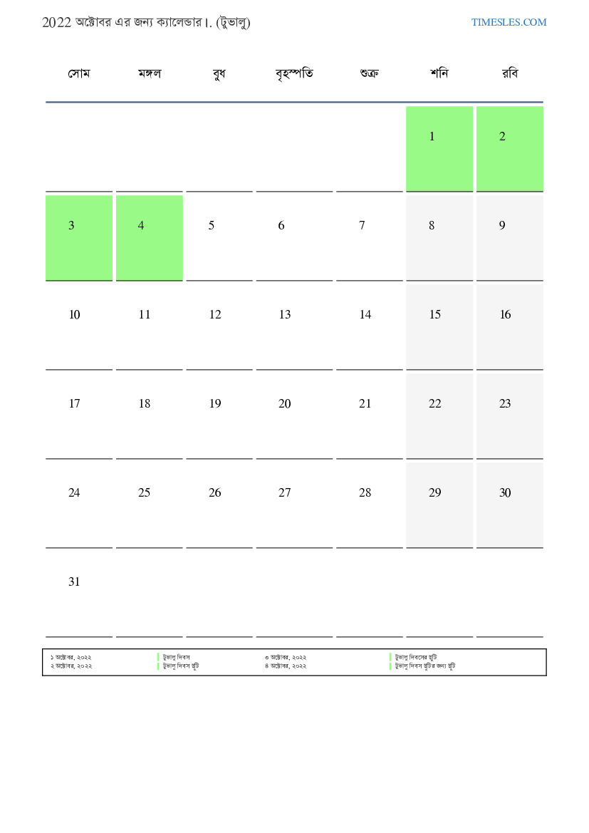টুভালুর জন্য 2022 অক্টোবর এর জন্য ছুটির দিন এবং সপ্তাহান্তের ক্যালেন্ডার