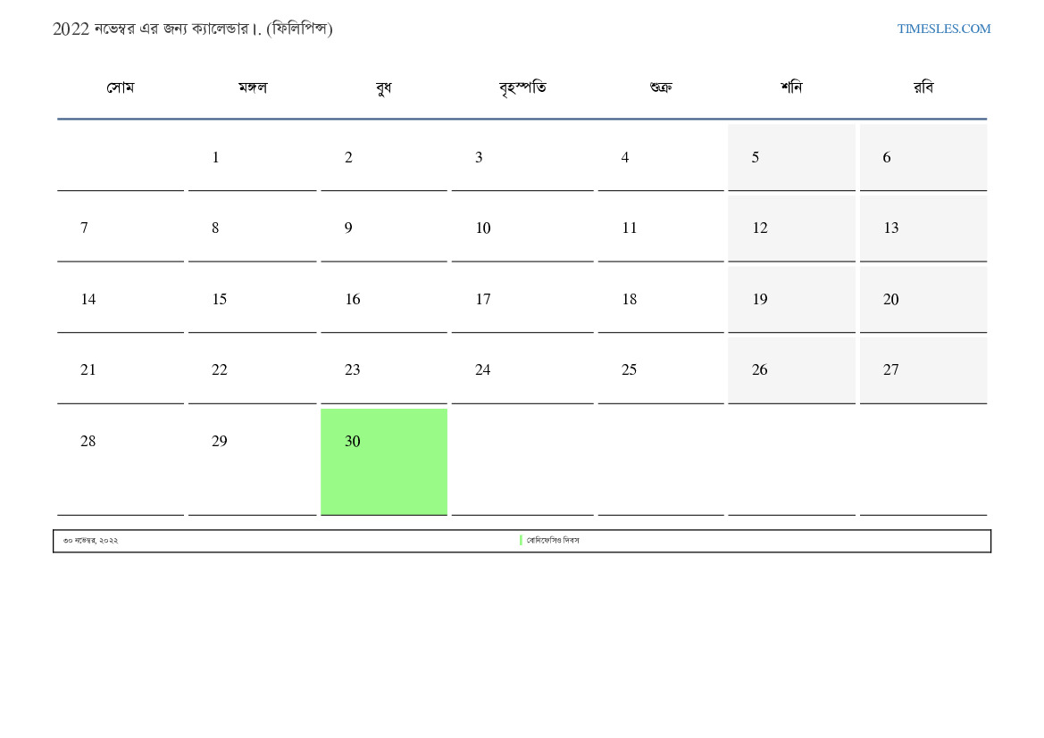ফিলিপাইন জন্য 2022 নভেম্বর এর জন্য ছুটির দিন এবং সপ্তাহান্তের ক্যালেন্ডার