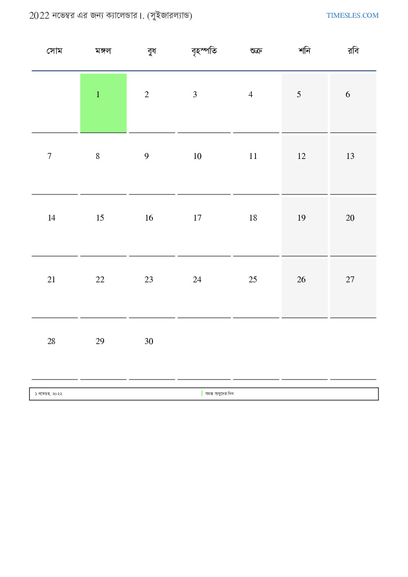 সুইজারল্যান্ডের জন্য 2022 নভেম্বর এর জন্য ছুটির দিন এবং সপ্তাহান্তের ক্যালেন্ডার