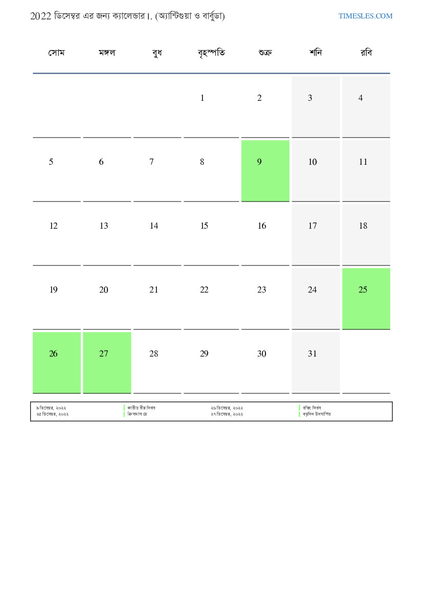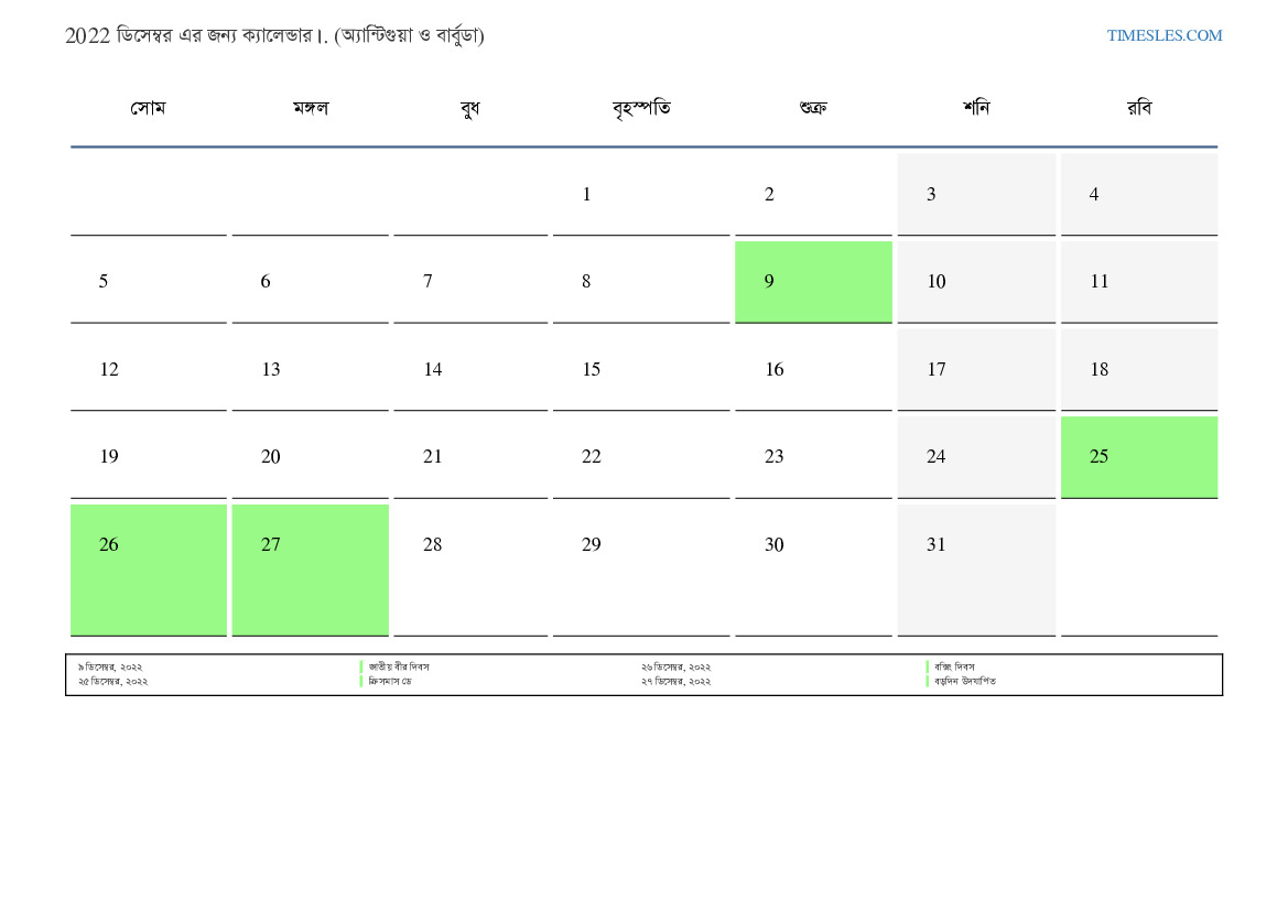 অ্যান্টিগুয়া এবং বার্বুডা জন্য 2022 ডিসেম্বর এর জন্য ছুটির দিন এবং সপ্তাহান্তের ক্যালেন্ডার
