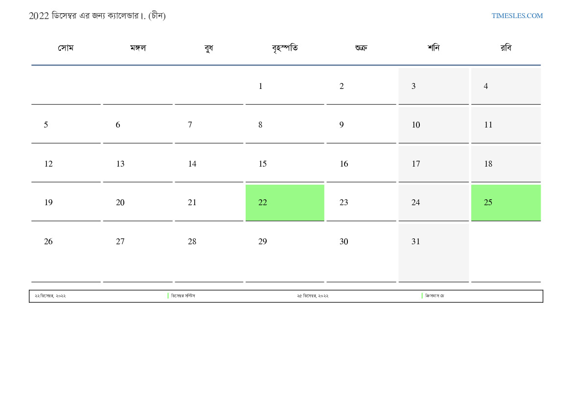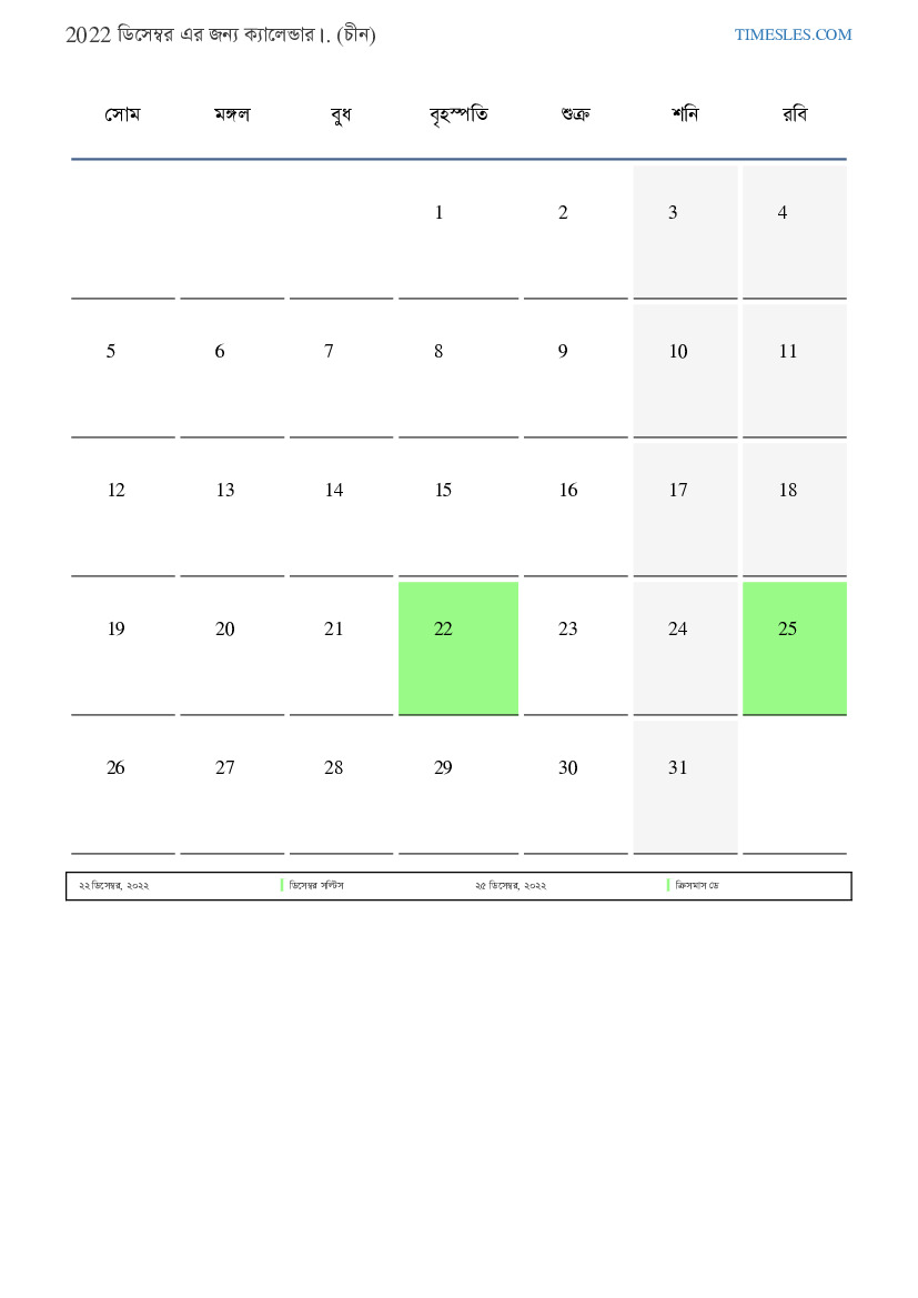 চীন জন্য 2022 ডিসেম্বর এর জন্য ছুটির দিন এবং সপ্তাহান্তের ক্যালেন্ডার