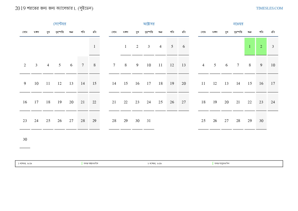 সুইডেনের জন্য 2019 সালের শরতের জন্য ছুটির দিনগুলি এবং সাপ্তাহিক ছুটির দিনগুলি