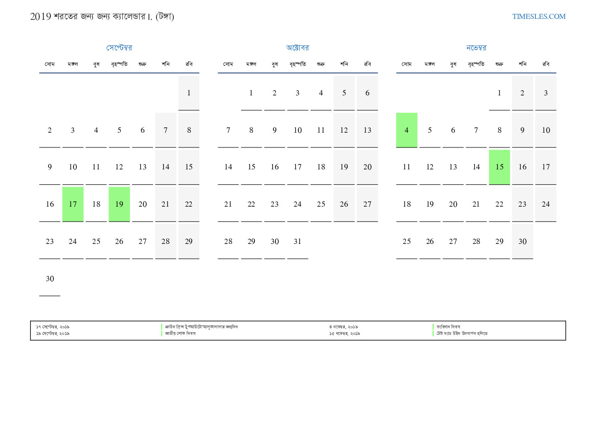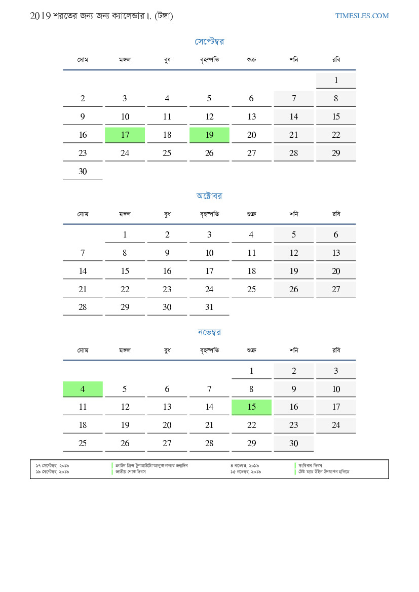টঙ্গার জন্য 2019 সালের শরতের জন্য ছুটি এবং সাপ্তাহিক ছুটির সাথে পিডিএফ ক্যালেন্ডার ডাউনলোড এবং মুদ্রণ করুন