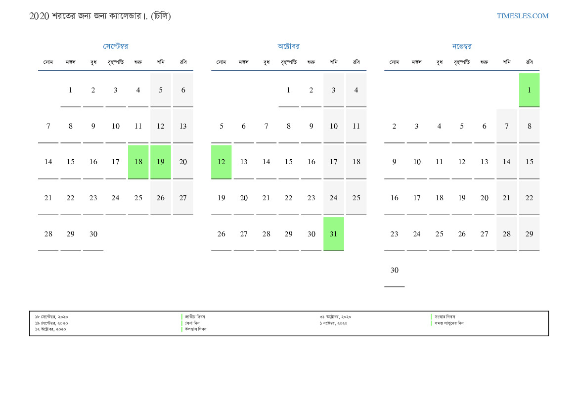 চিলির জন্য 2020 সালের শরতের জন্য ক্যালেন্ডার