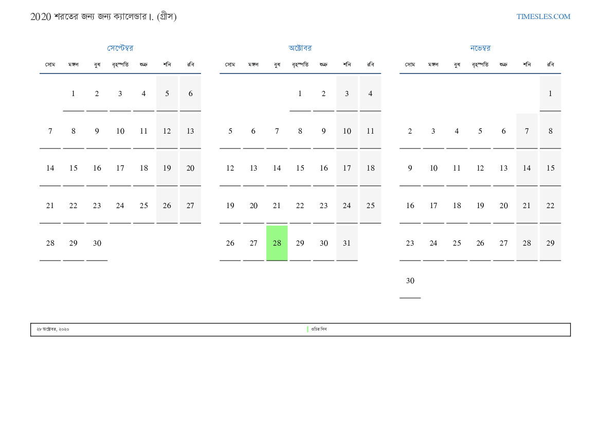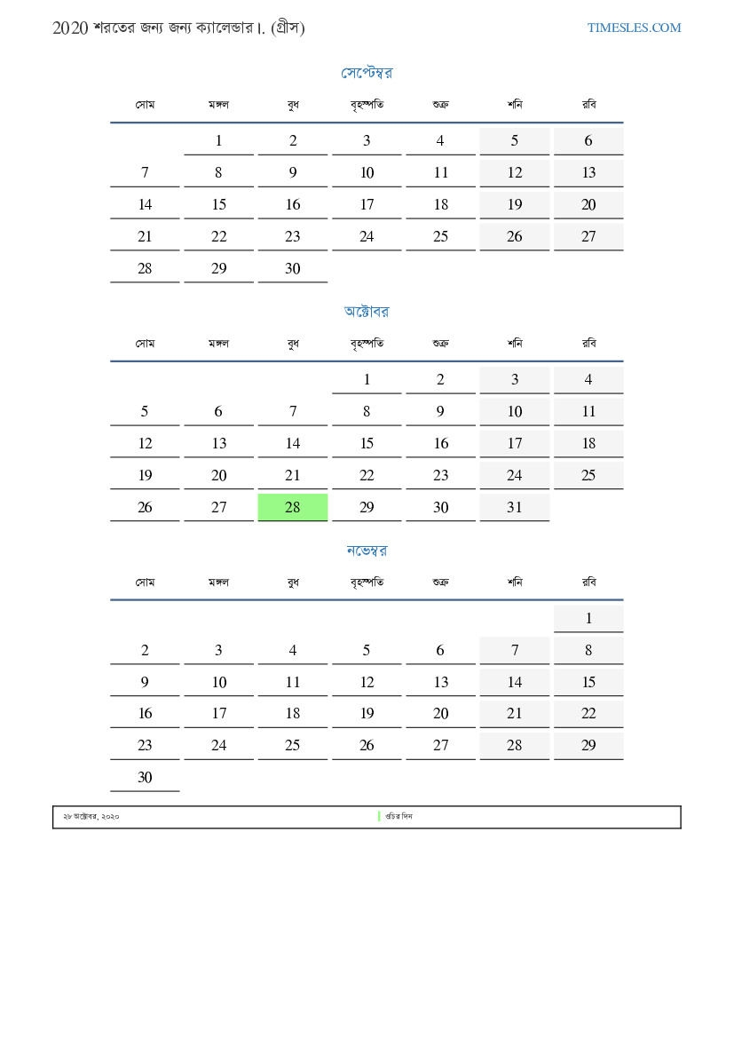 2020 সালের শরৎকালে গ্রীকে ৪ ছুটি এবং দিন ছুটি থাকে। শরত কালীন 2121 মঙ্গলবারে শুরু হয়ে সোমবারে শেষ হবে।