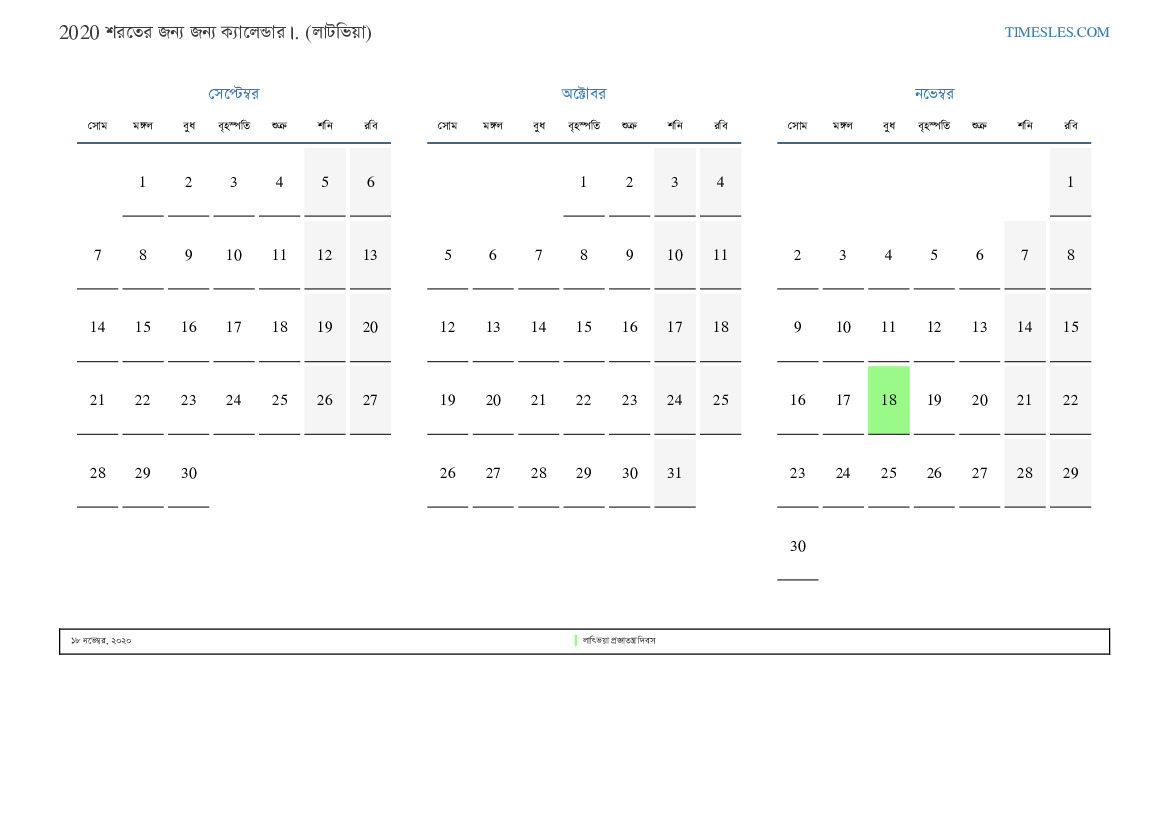 লাটভিয়ার জন্য 2020 সালের শরতের জন্য ক্যালেন্ডার
