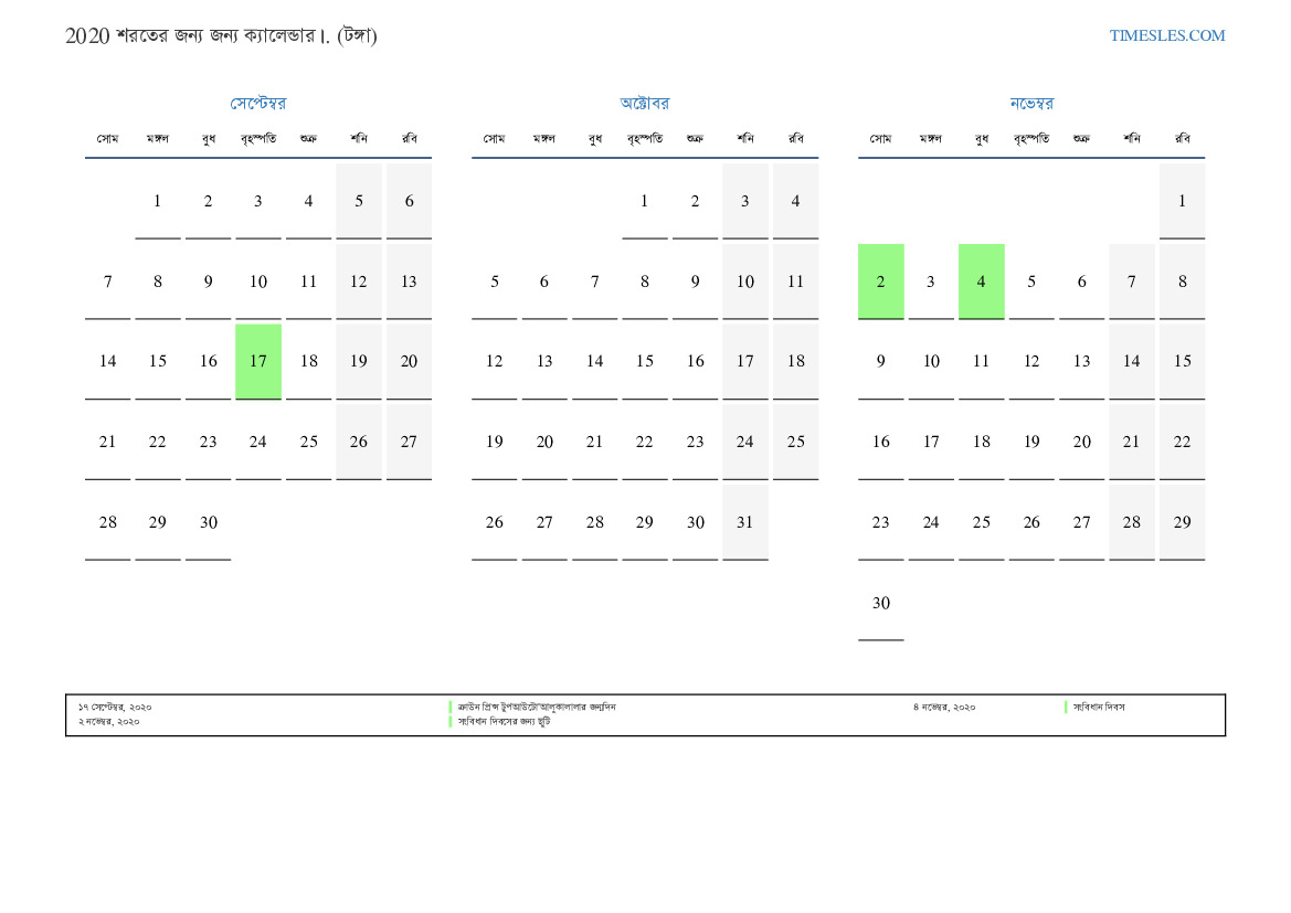 টঙ্গার জন্য 2020 সালের শরতের জন্য ক্যালেন্ডার