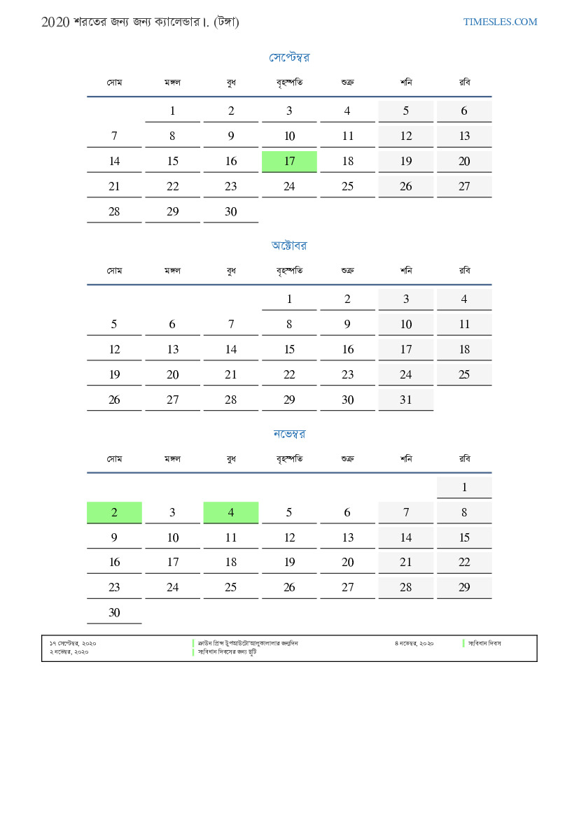টঙ্গার জন্য 2020 সালের শরতের জন্য ছুটি এবং সাপ্তাহিক ছুটির সাথে পিডিএফ ক্যালেন্ডার ডাউনলোড এবং মুদ্রণ করুন