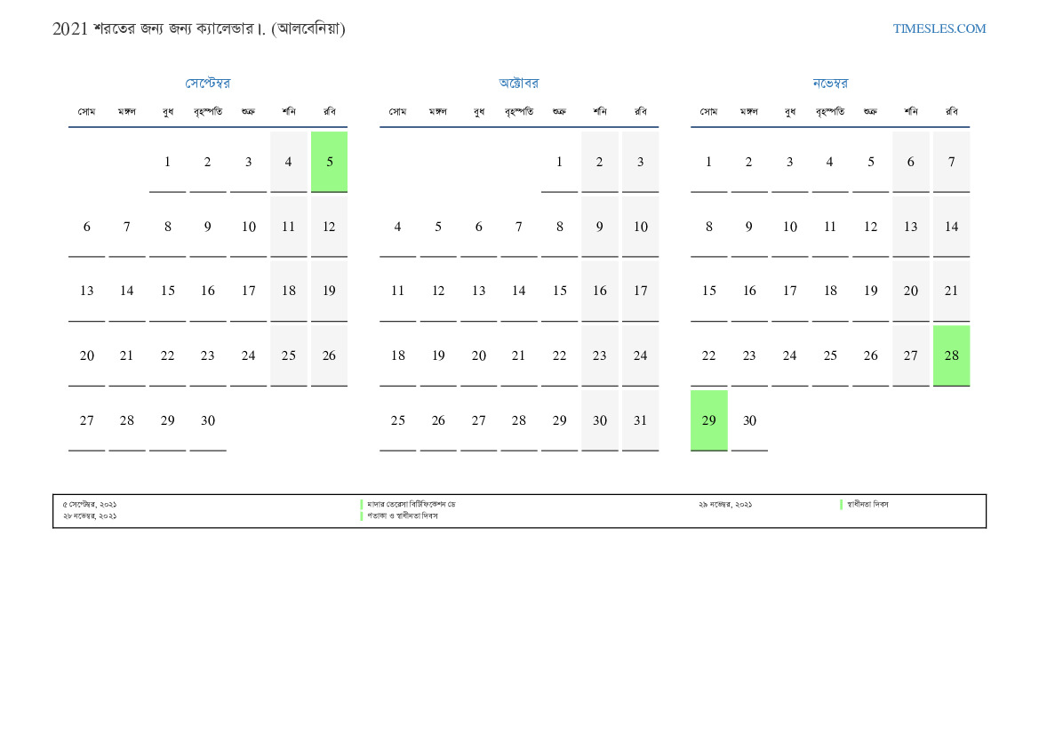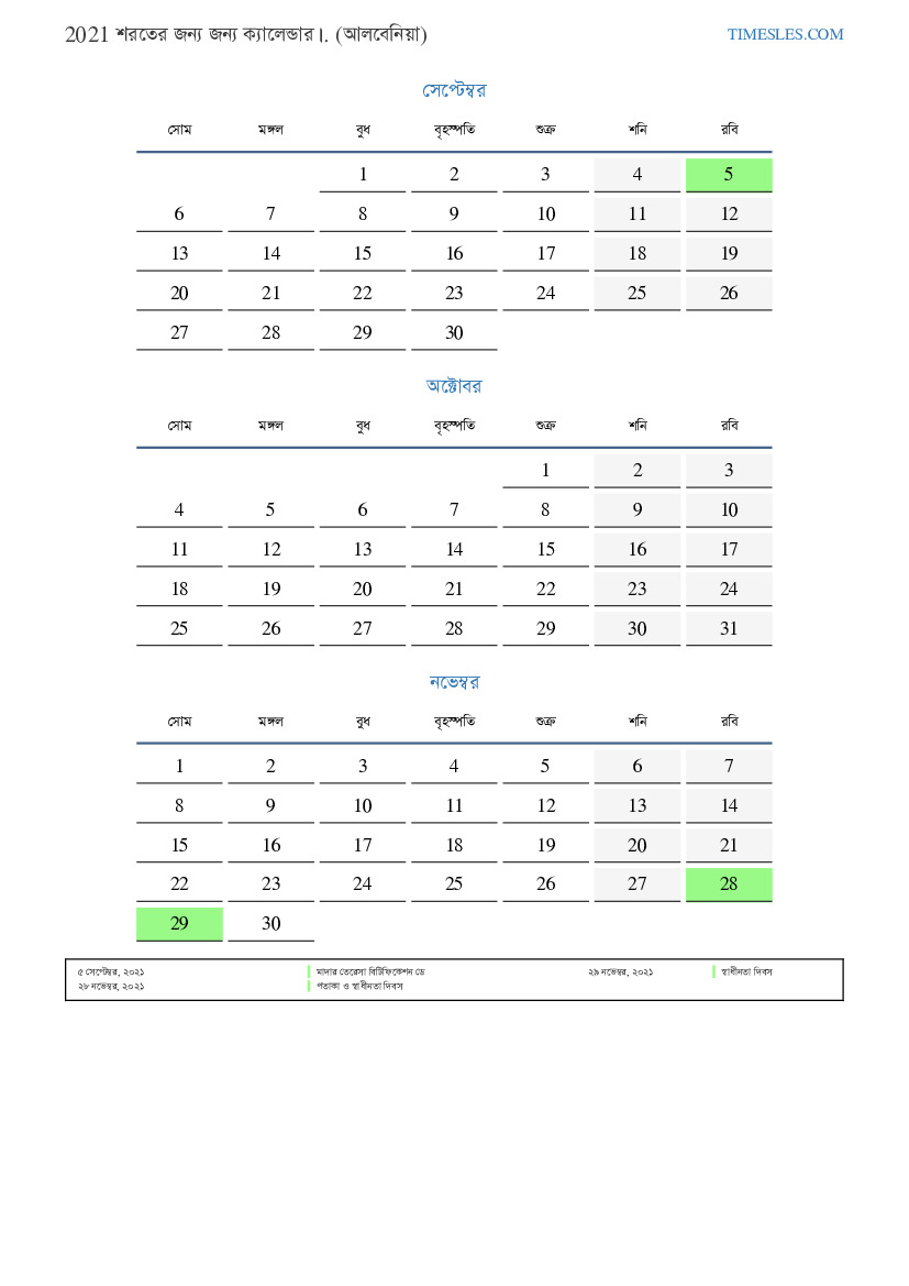 আলবেনিয়ার জন্য 2021 সালের শরতের জন্য ছুটি এবং সাপ্তাহিক ছুটির সাথে পিডিএফ ক্যালেন্ডার ডাউনলোড এবং মুদ্রণ করুন