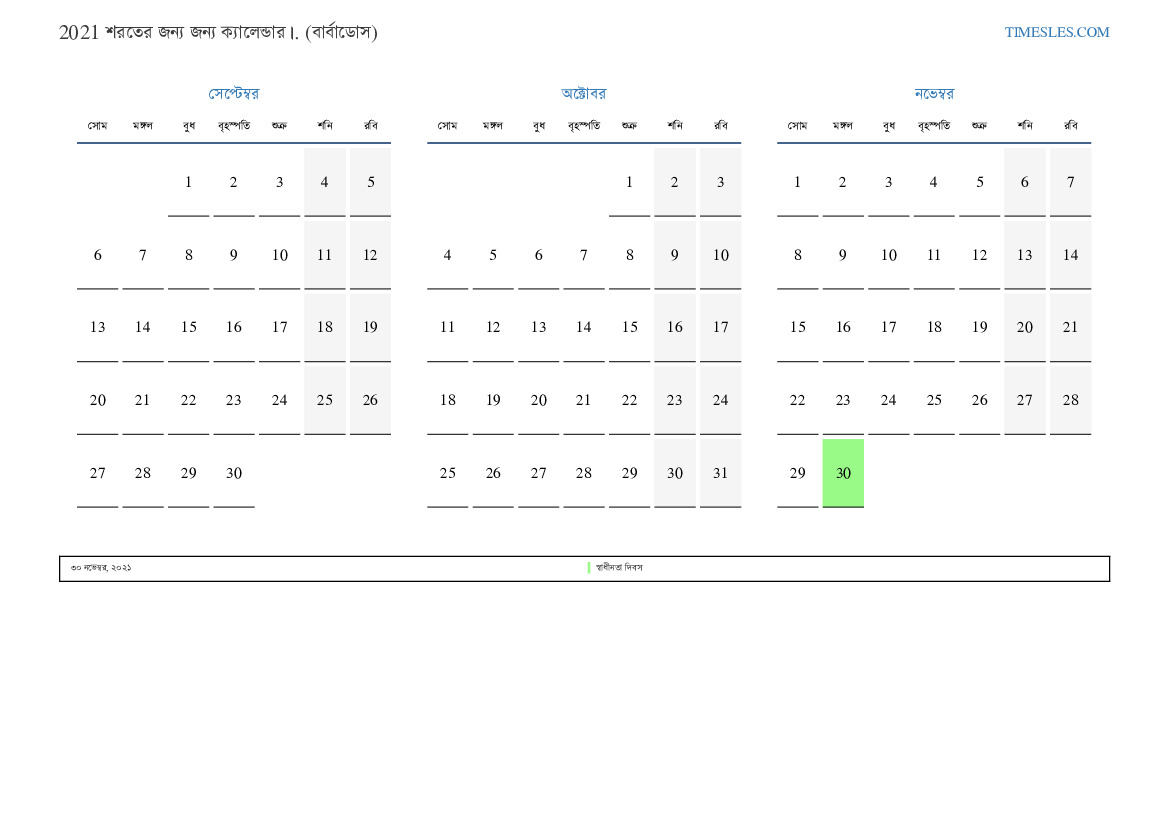 বার্বাডোসের জন্য 2021 সালের শরতের জন্য ক্যালেন্ডার