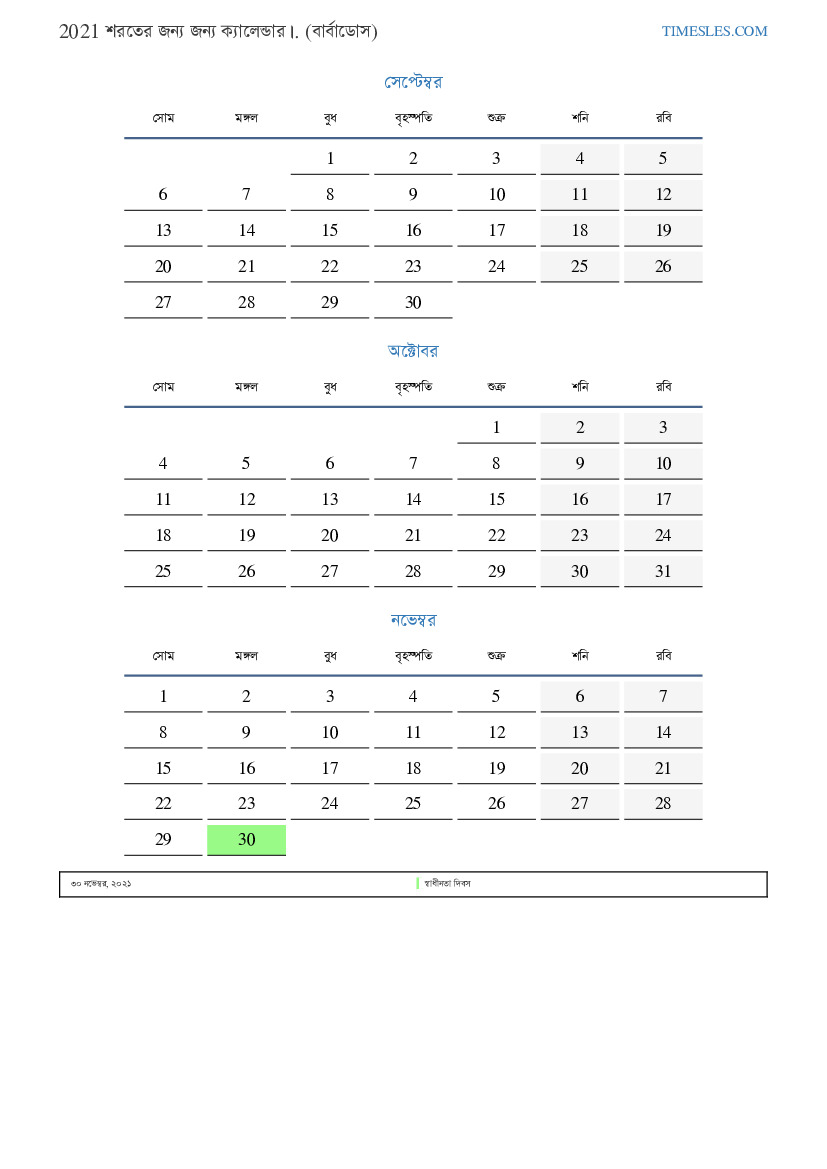 বার্বাডোসের জন্য 2021 সালের শরতের জন্য ছুটি এবং সাপ্তাহিক ছুটির সাথে পিডিএফ ক্যালেন্ডার ডাউনলোড এবং মুদ্রণ করুন