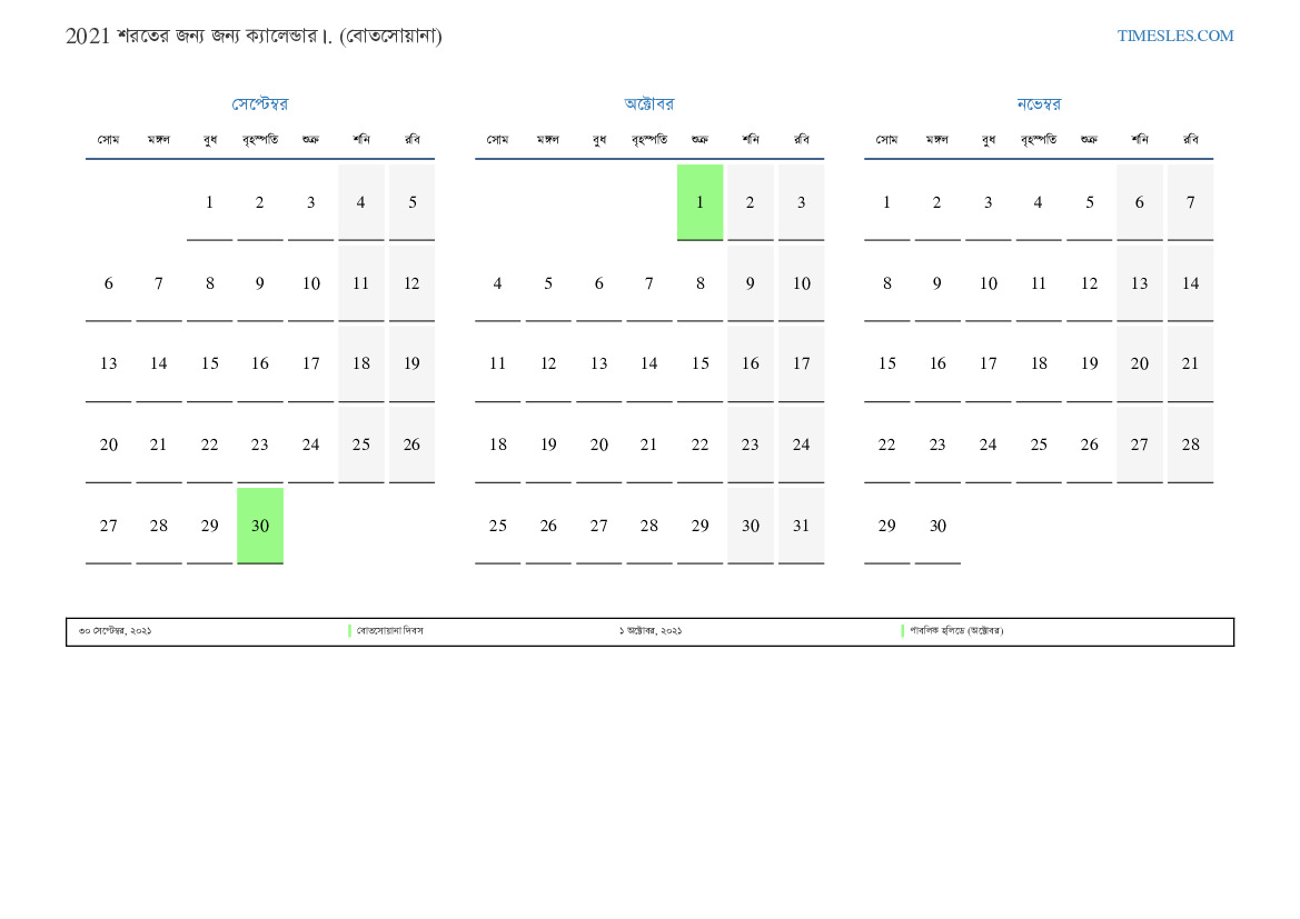 বতসোয়ানা জন্য 2021 সালের শরতের জন্য ক্যালেন্ডার