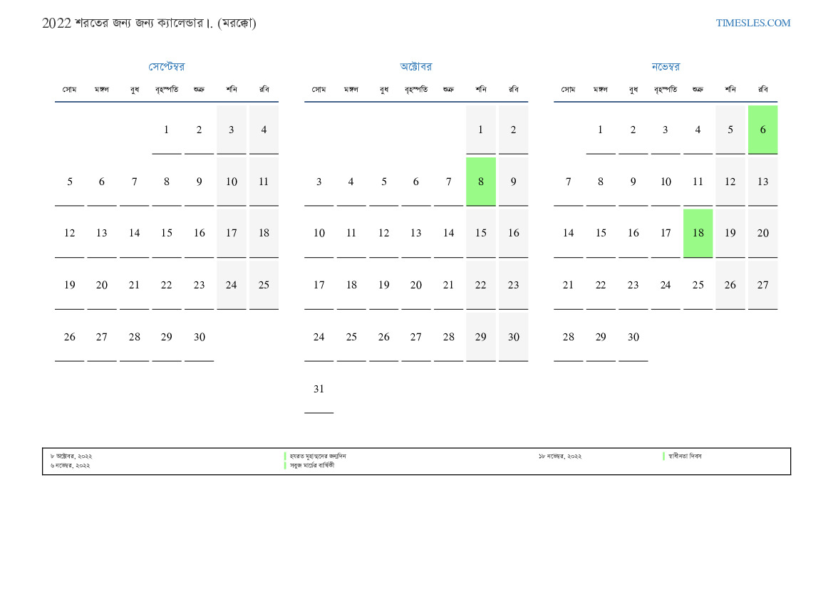 মরক্কোর জন্য 2022 সালের শরতের জন্য ক্যালেন্ডার