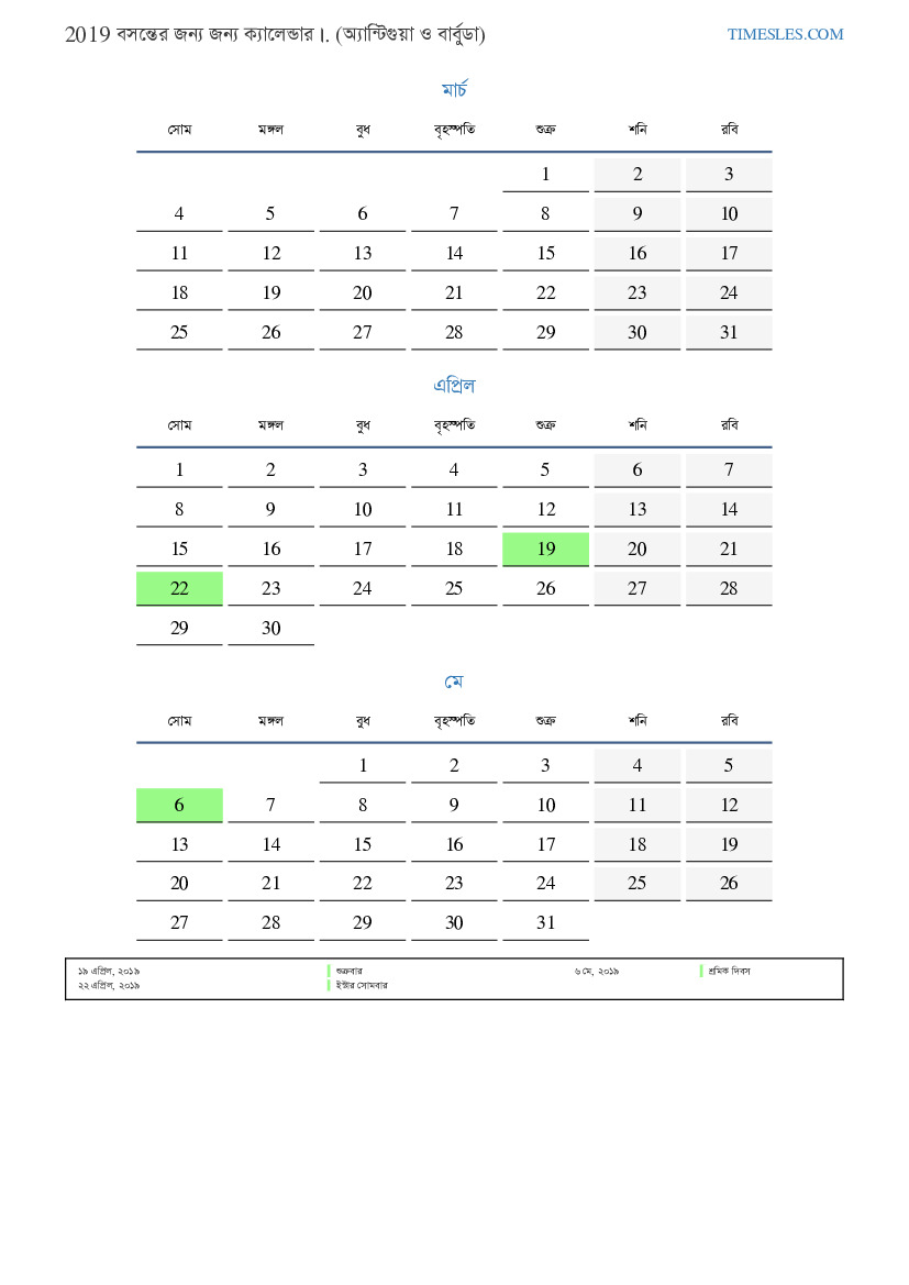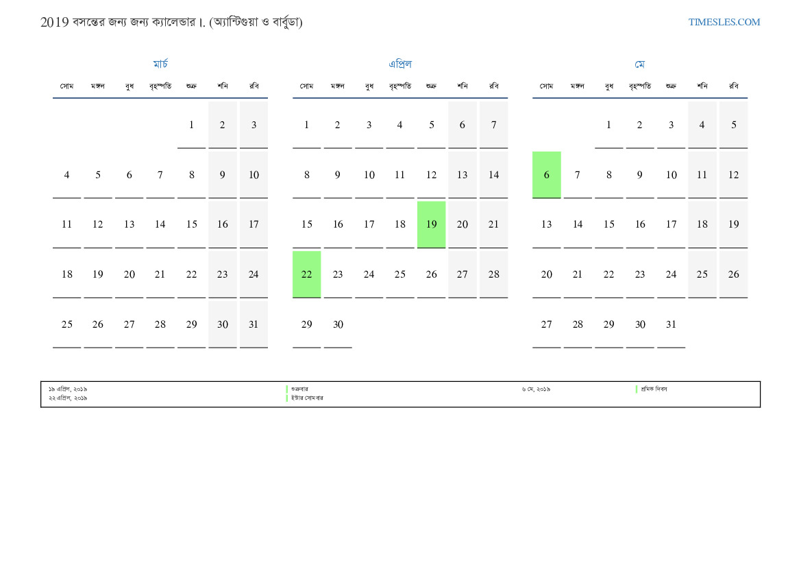 অ্যান্টিগুয়া এবং বার্বুডা জন্য 2019 সালের বসন্তের জন্য ক্যালেন্ডার
