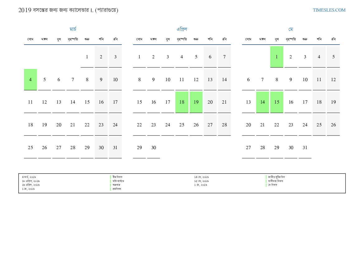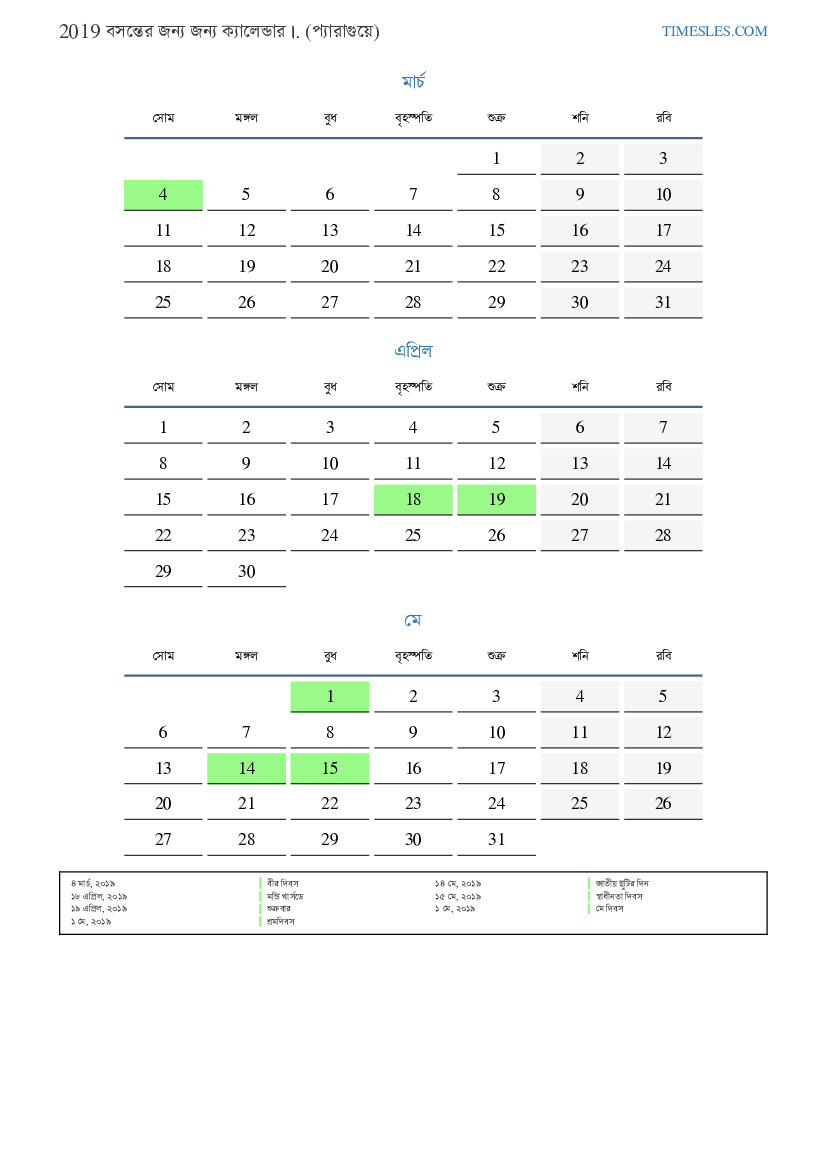 প্যারাগুয়ের জন্য 2019 সালের বসন্তের জন্য ছুটির দিনগুলি এবং সাপ্তাহিক ছুটির দিনগুলি