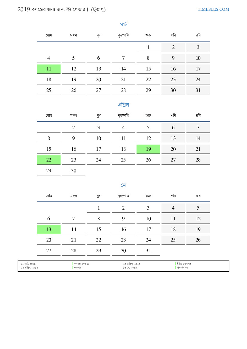 টুভালুর জন্য 2019 সালের বসন্তের জন্য ক্যালেন্ডার