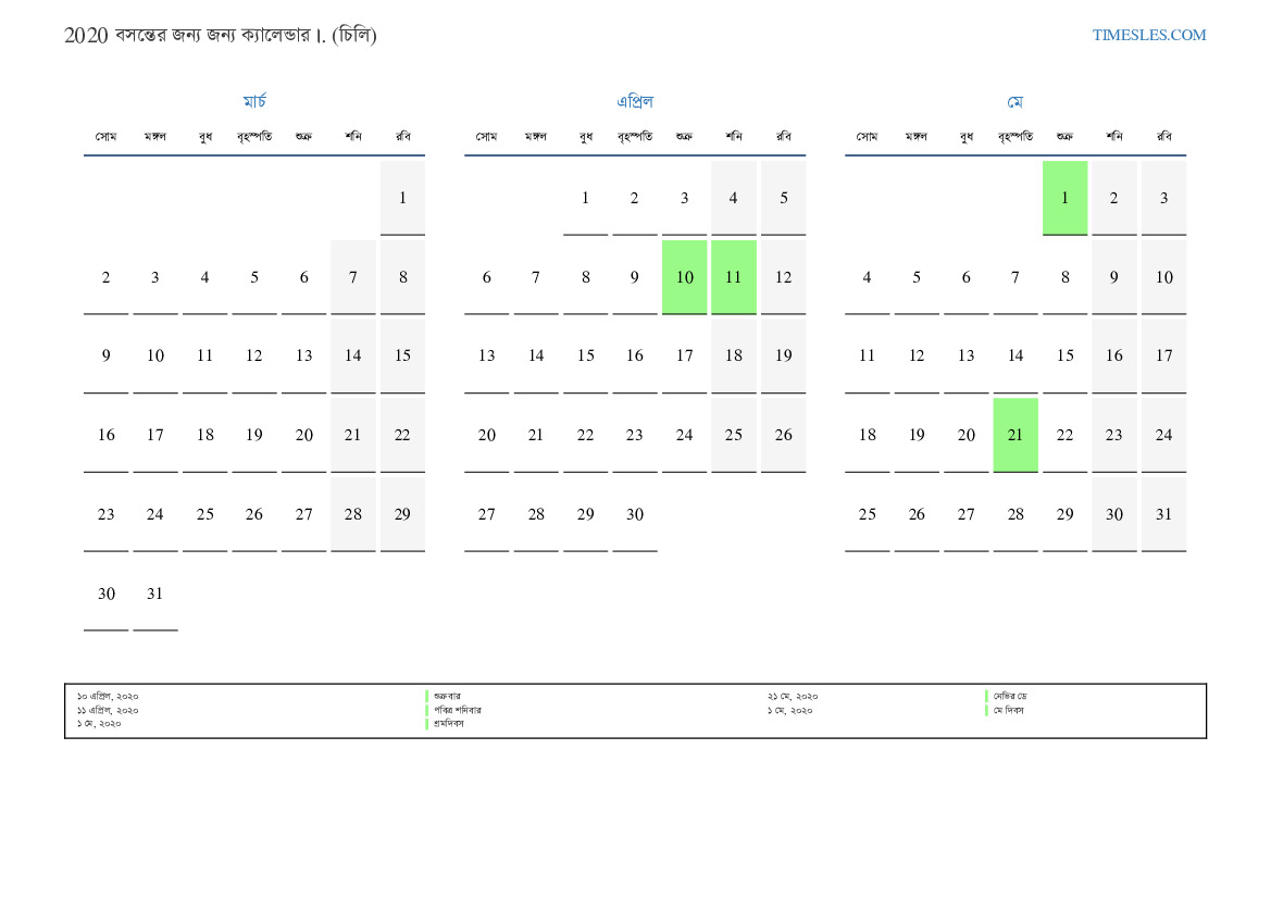 চিলির জন্য 2020 সালের বসন্তের জন্য ক্যালেন্ডার