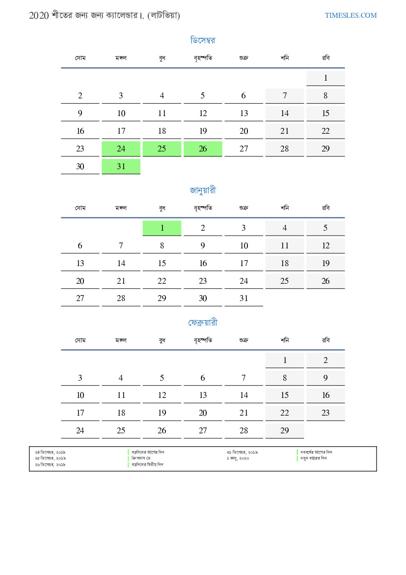 ছুটির দিনগুলি ল্যান্ডস্কেপ ক্যালেন্ডার