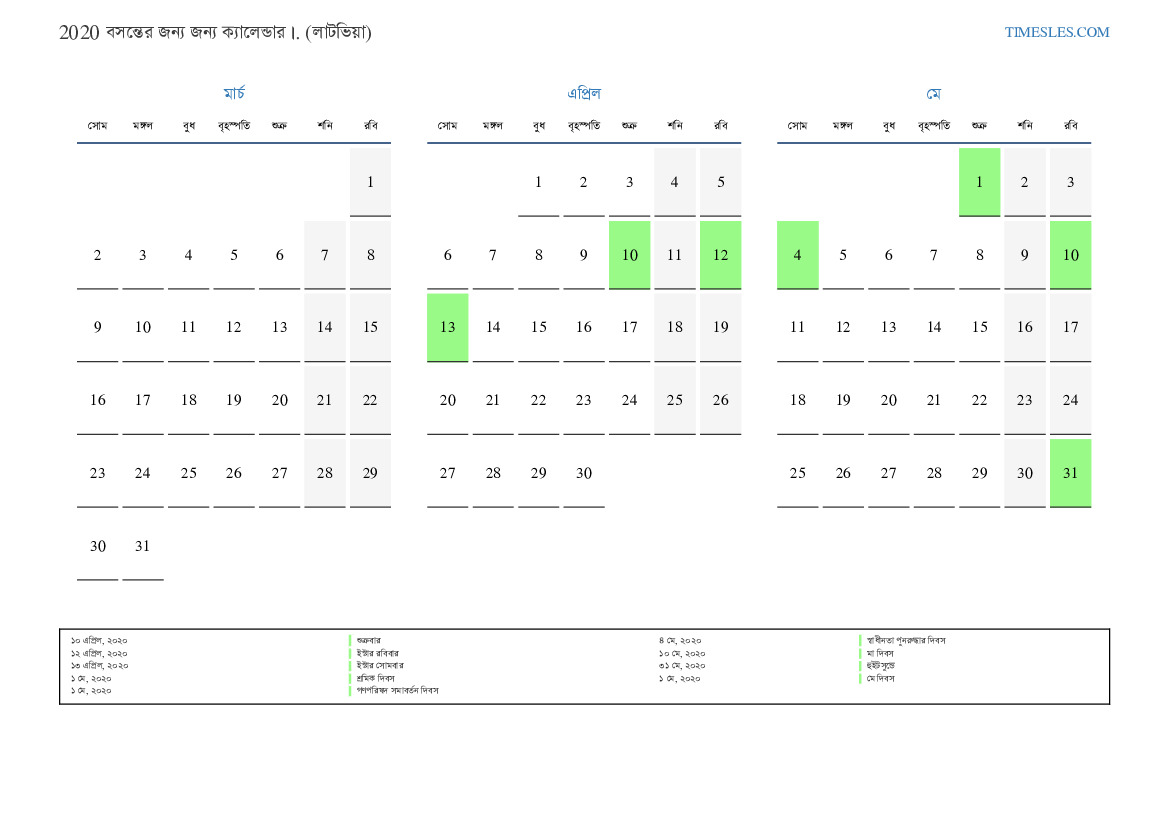 লাটভিয়ার জন্য 2020 সালের বসন্তের জন্য ছুটি এবং সাপ্তাহিক ছুটির সাথে পিডিএফ ক্যালেন্ডার ডাউনলোড এবং মুদ্রণ করুন