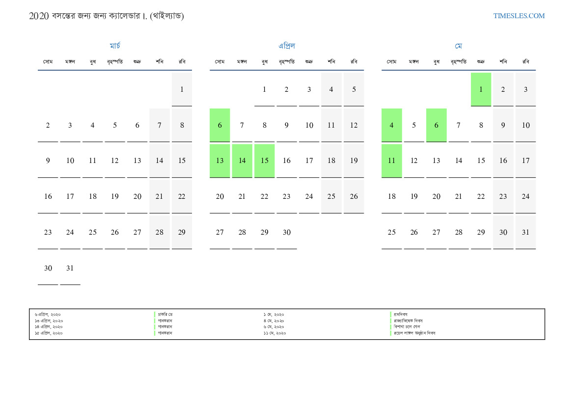 থাইল্যান্ডের জন্য 2020 সালের বসন্তের জন্য ক্যালেন্ডার