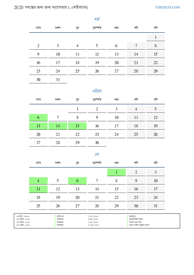 থাইল্যান্ডের জন্য 2020 সালের বসন্তের জন্য ছুটি এবং সাপ্তাহিক ছুটির সাথে পিডিএফ ক্যালেন্ডার ডাউনলোড এবং মুদ্রণ করুন