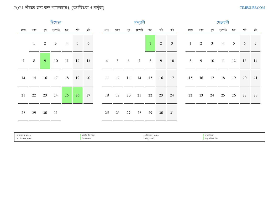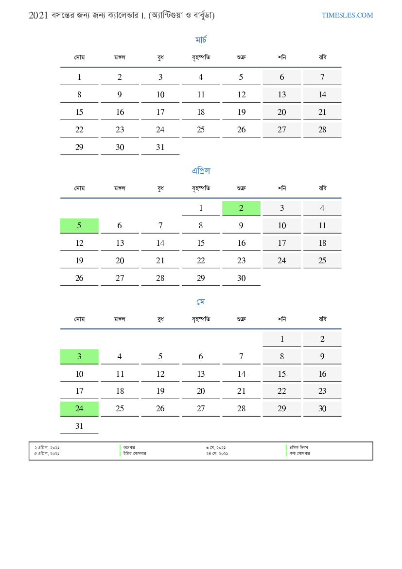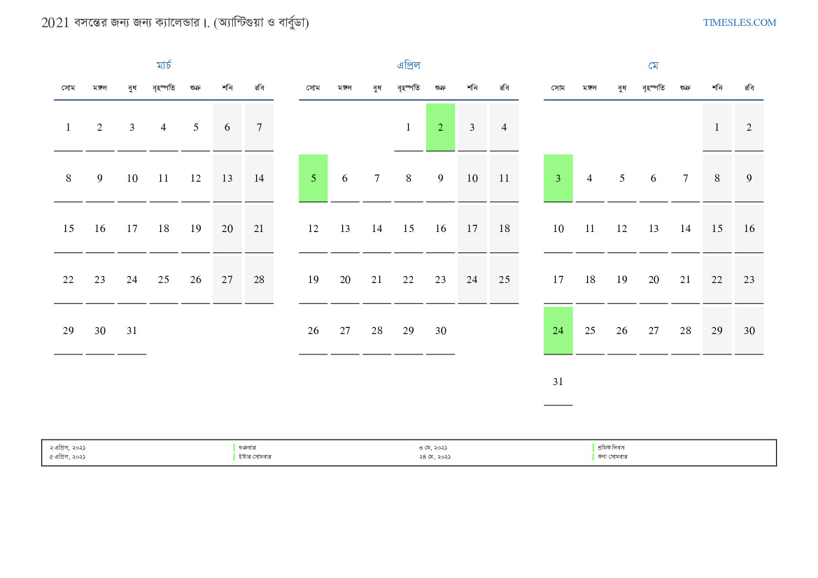 অ্যান্টিগুয়া এবং বার্বুডা জন্য 2021 সালের বসন্তের জন্য ক্যালেন্ডার