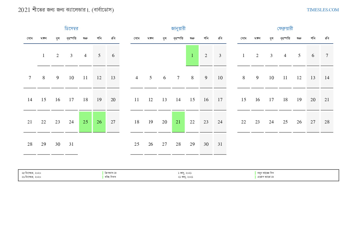 বার্বাডোসের জন্য 2021 সালের বসন্তের জন্য ছুটির দিনগুলি এবং সাপ্তাহিক ছুটির দিনগুলি