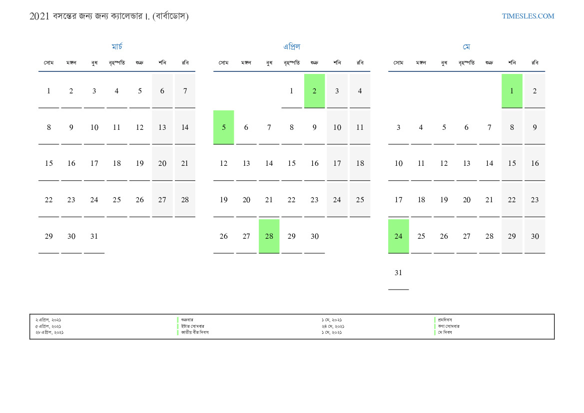 বার্বাডোসের জন্য 2021 সালের বসন্তের জন্য ক্যালেন্ডার