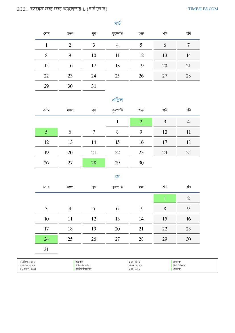 বার্বাডোসের জন্য 2021 সালের বসন্তের জন্য ছুটি এবং সাপ্তাহিক ছুটির সাথে পিডিএফ ক্যালেন্ডার ডাউনলোড এবং মুদ্রণ করুন
