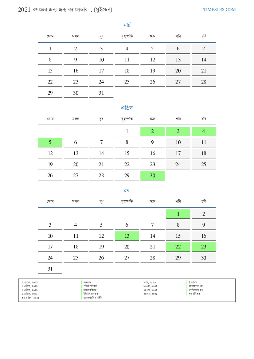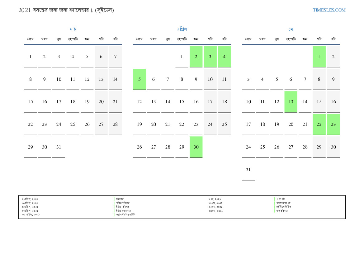 সুইডেনের জন্য 2021 সালের বসন্তের জন্য ছুটির দিনগুলি এবং সাপ্তাহিক ছুটির দিনগুলি