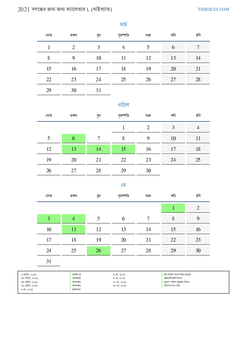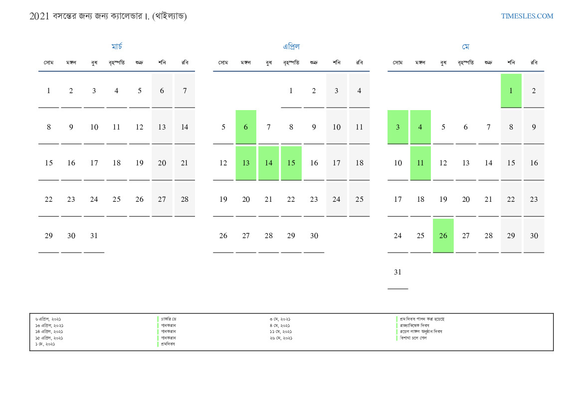 থাইল্যান্ডের জন্য 2021 সালের বসন্তের জন্য ক্যালেন্ডার
