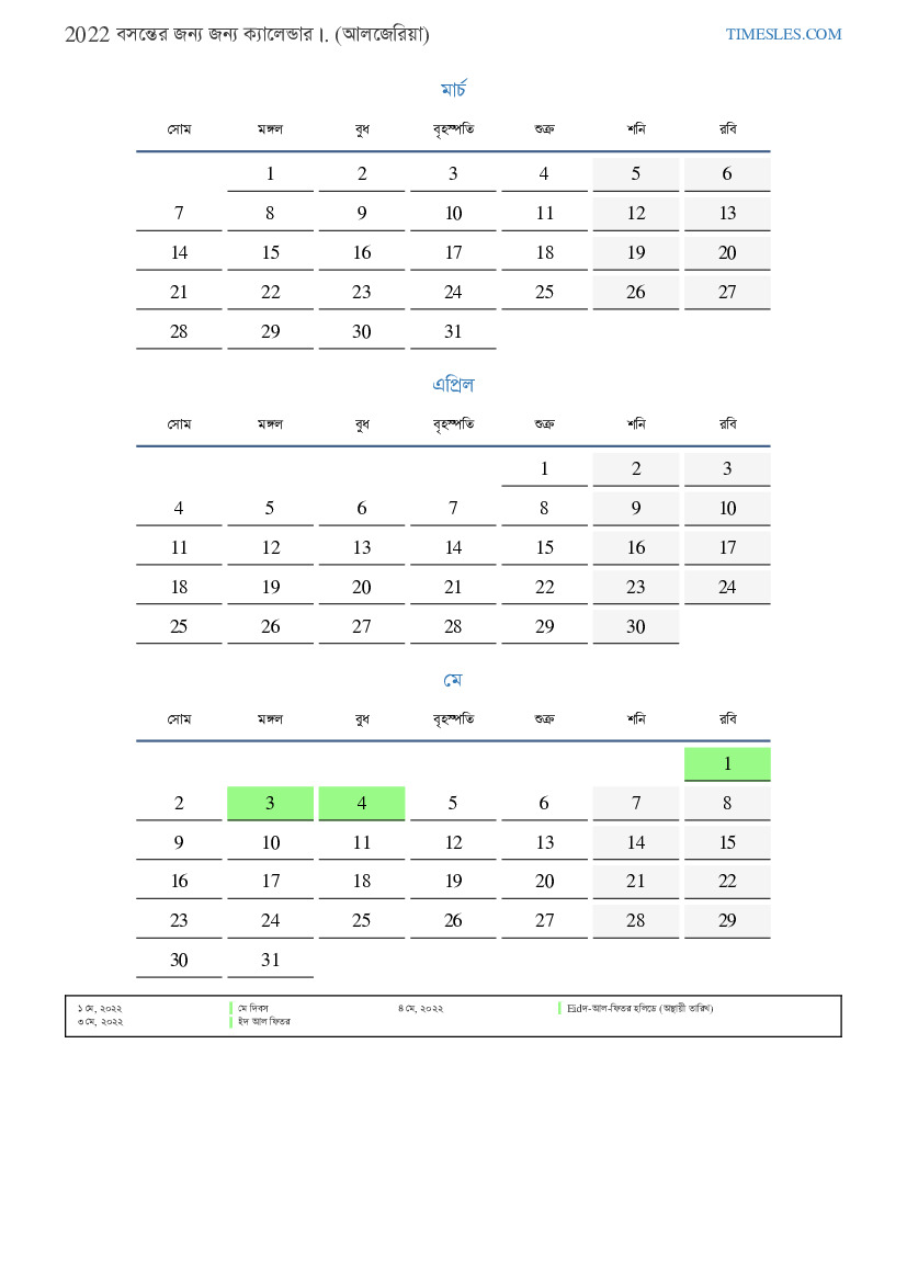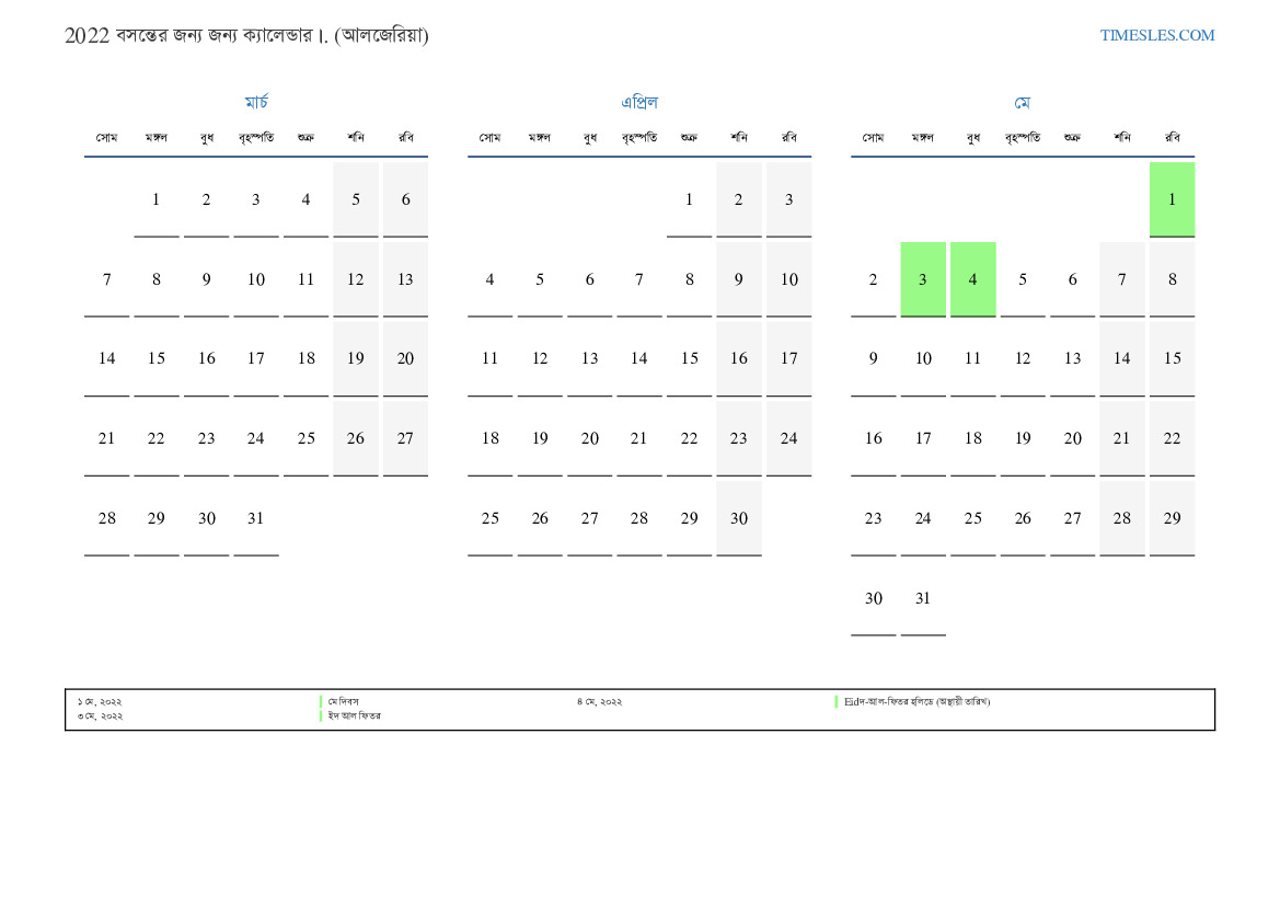 আলজেরিয়ার জন্য 2022 সালের বসন্তের জন্য ক্যালেন্ডার