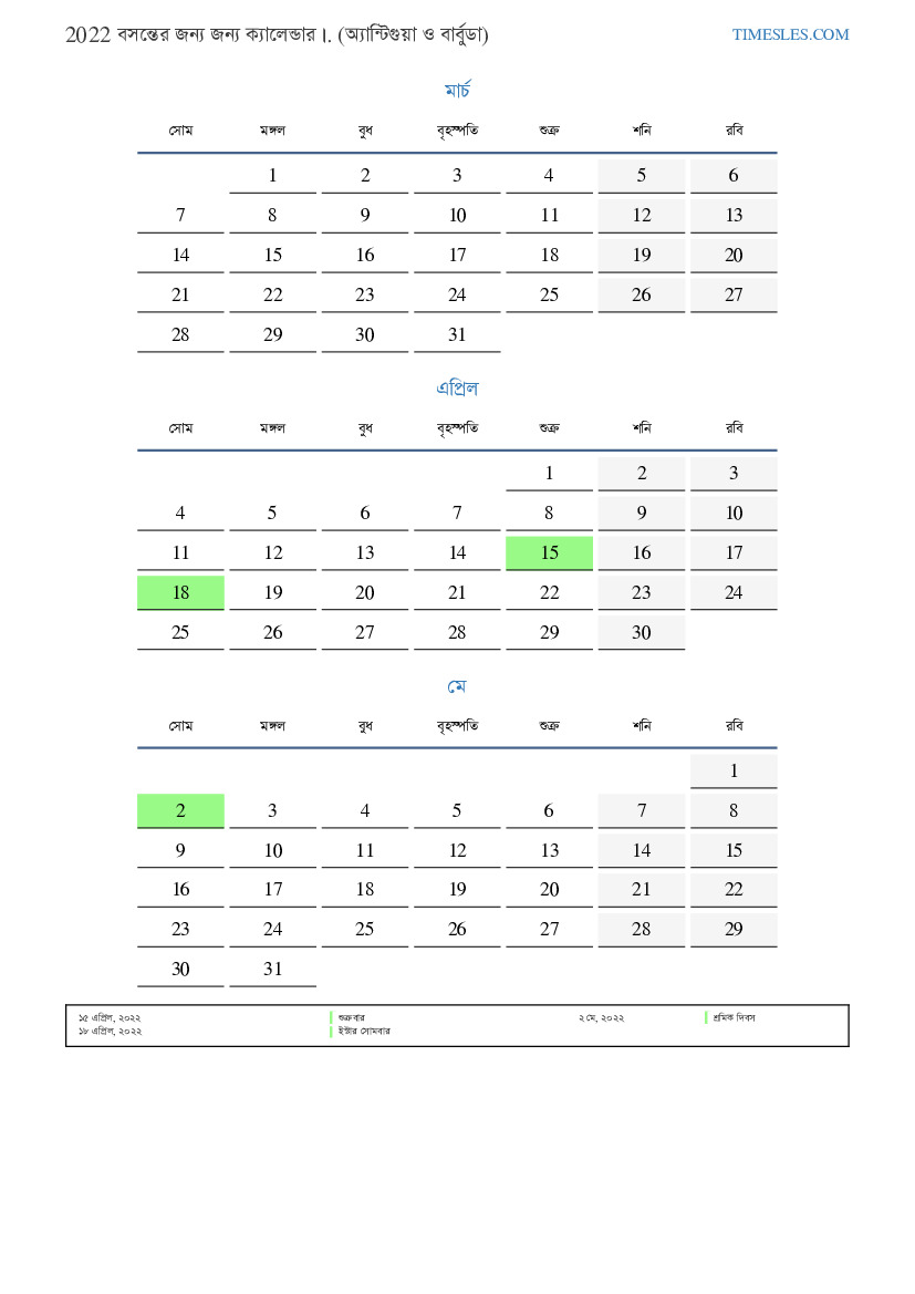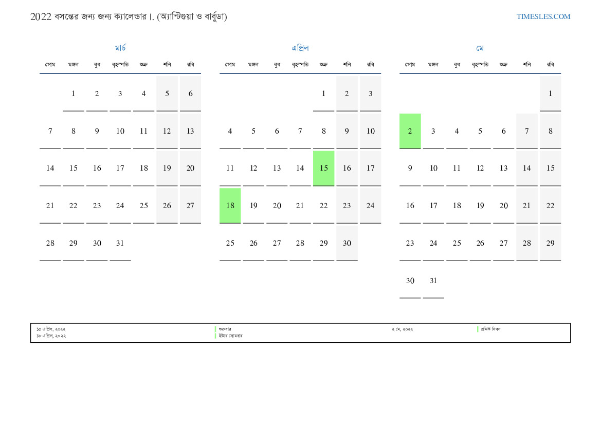 অ্যান্টিগুয়া এবং বার্বুডা জন্য 2022 সালের বসন্তের জন্য ক্যালেন্ডার