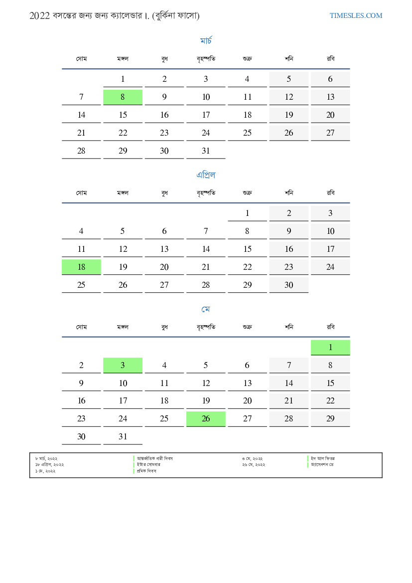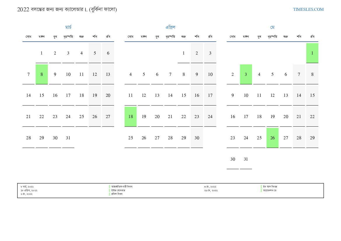 বুর্কিনা ফাসোর জন্য 2022 সালের বসন্তের জন্য ক্যালেন্ডার