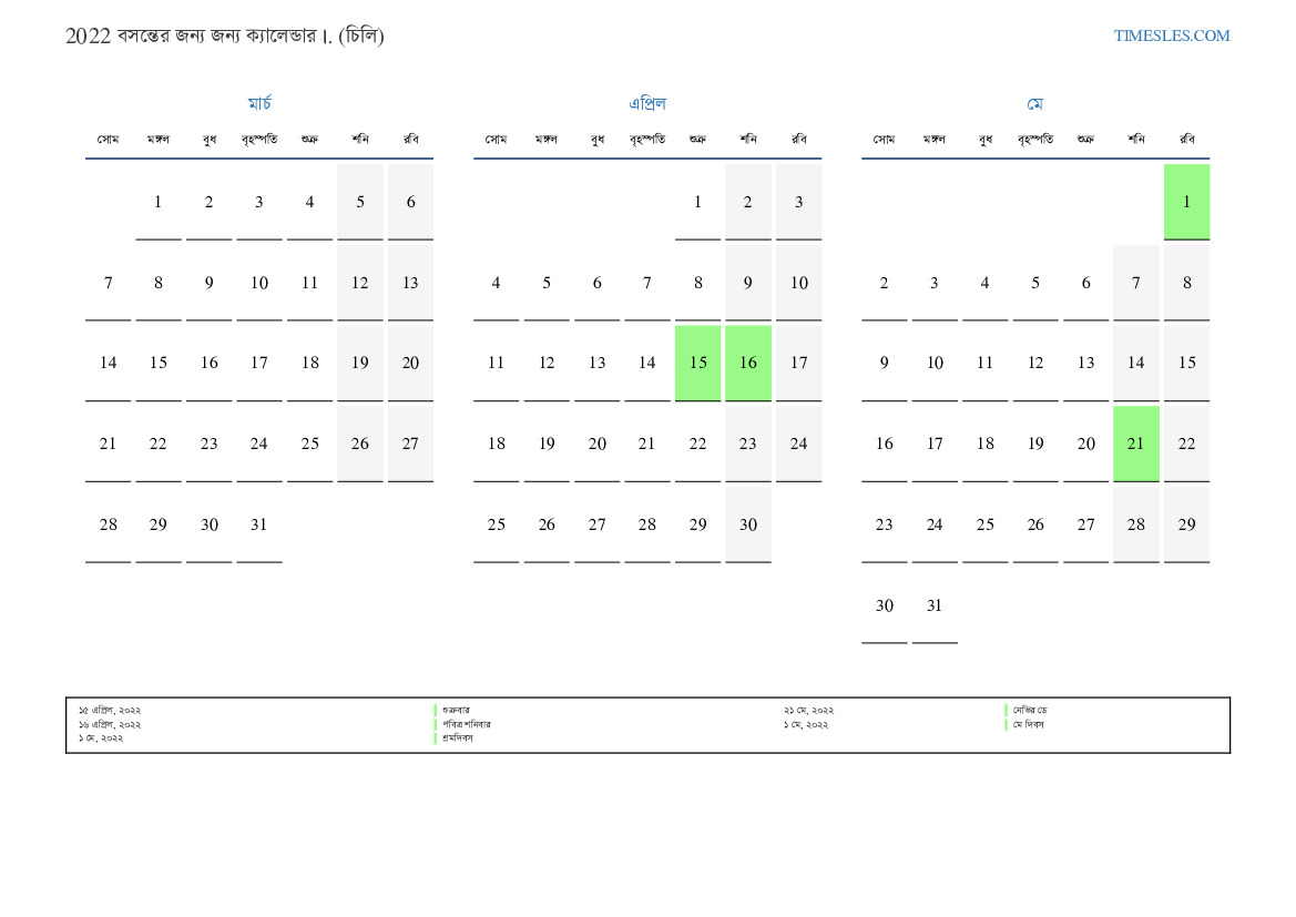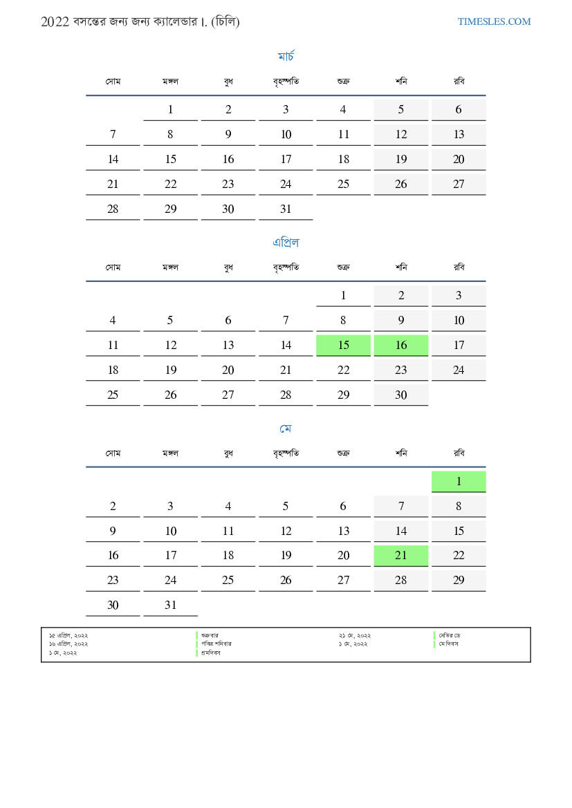 চিলির জন্য 2022 সালের বসন্তের জন্য ক্যালেন্ডার