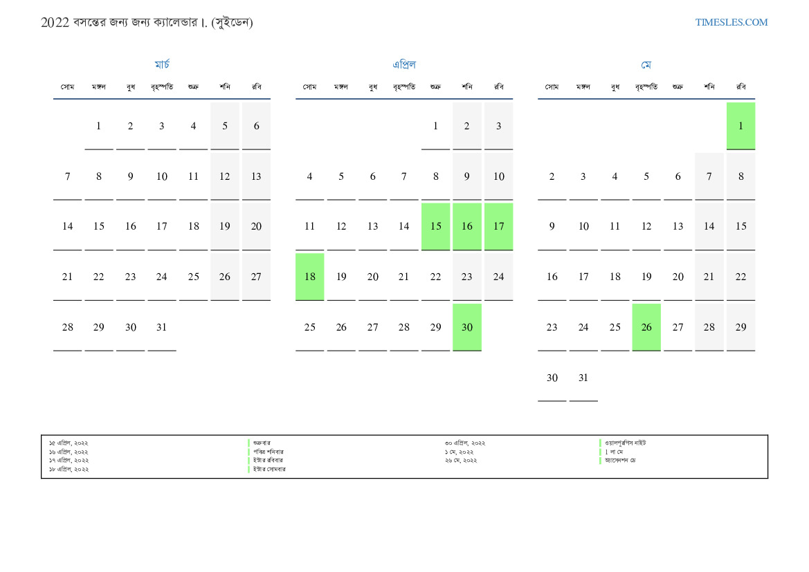 সুইডেনের জন্য 2022 সালের বসন্তের জন্য ছুটির দিনগুলি এবং সাপ্তাহিক ছুটির দিনগুলি