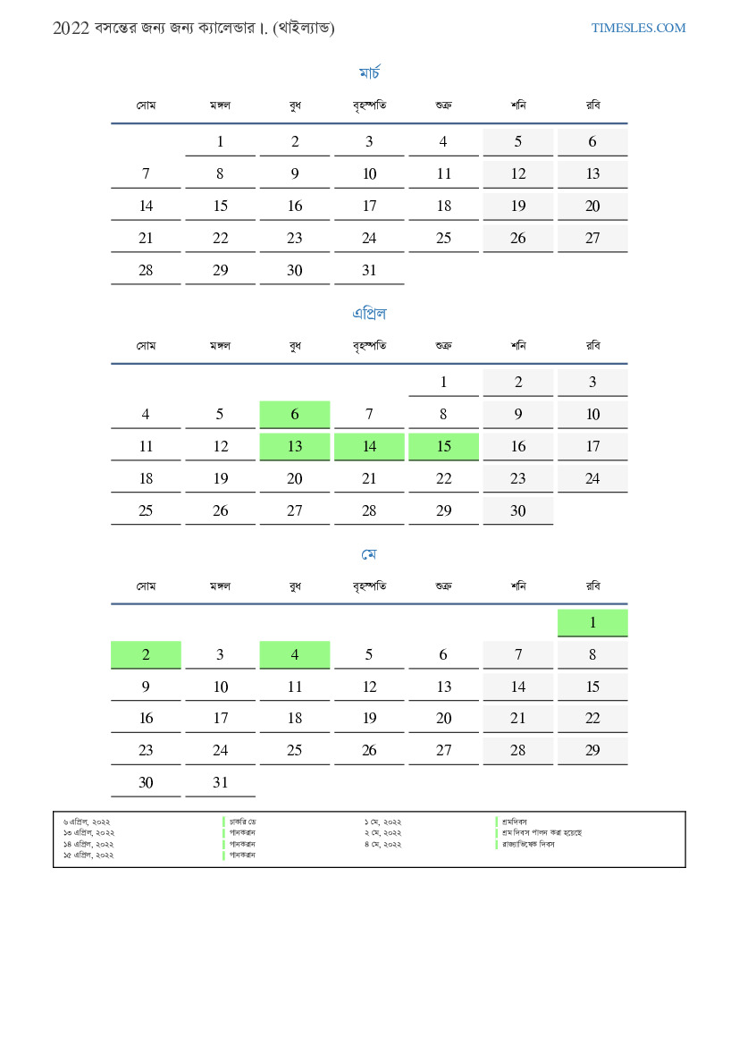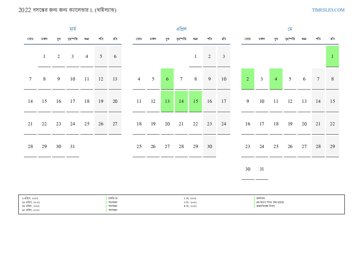 থাইল্যান্ডের জন্য 2022 সালের বসন্তের জন্য ক্যালেন্ডার