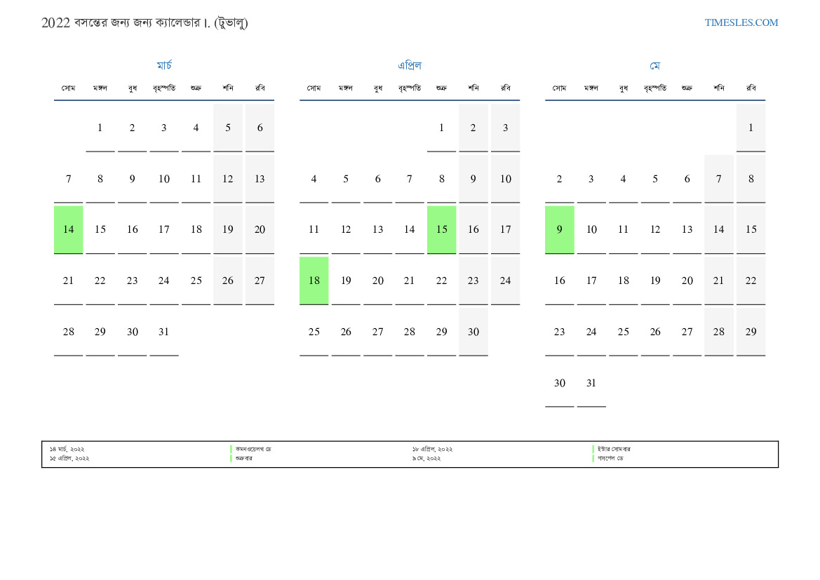 টুভালুর জন্য 2022 সালের বসন্তের জন্য ক্যালেন্ডার
