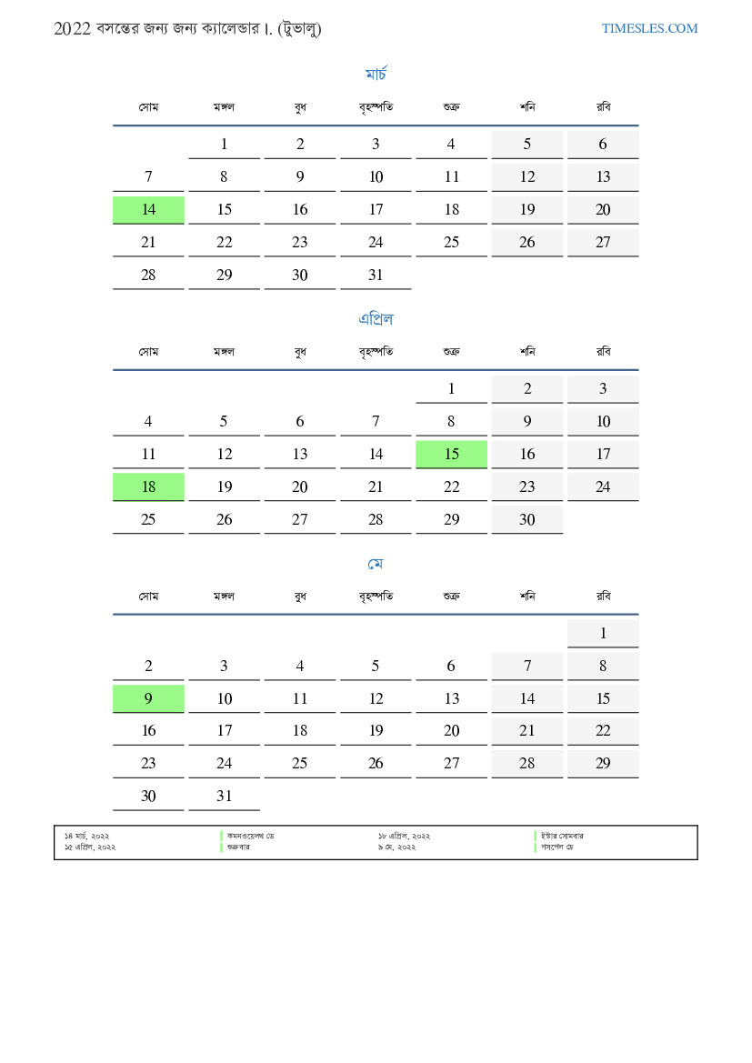 টুভালুর জন্য 2022 সালের বসন্তের জন্য ছুটির দিনগুলি এবং সাপ্তাহিক ছুটির দিনগুলি
