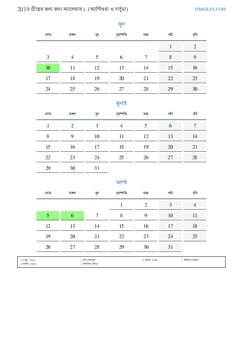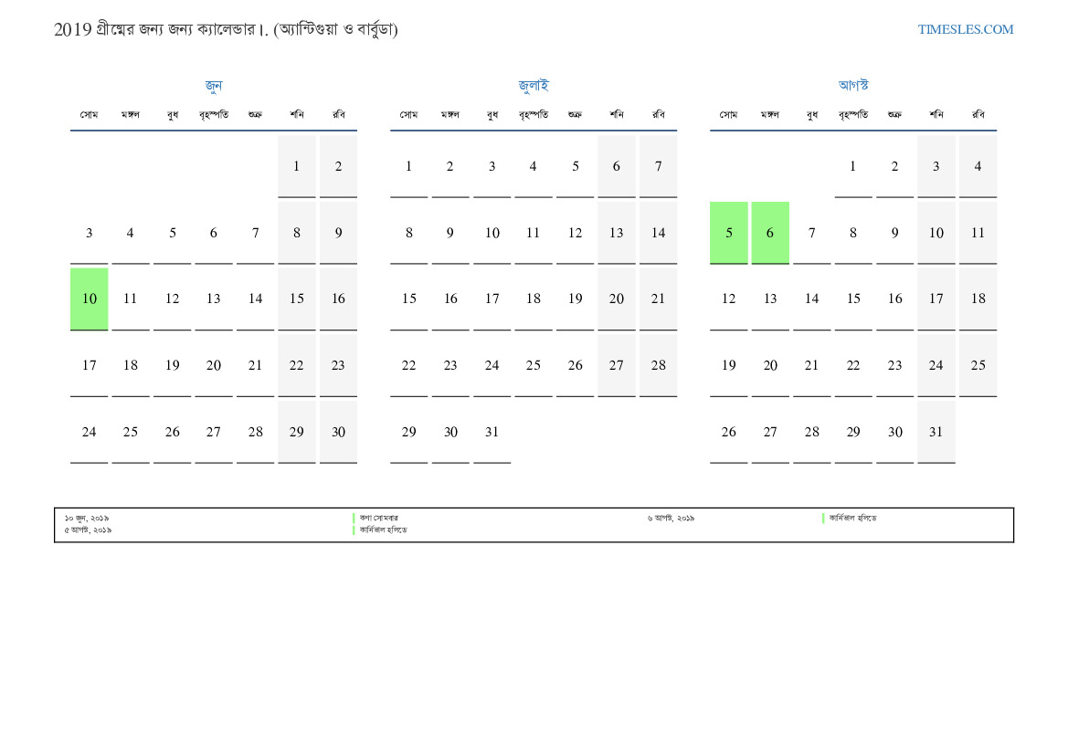 অ্যান্টিগুয়া এবং বার্বুডা জন্য 2019 সালের গ্রীষ্মের জন্য ক্যালেন্ডার