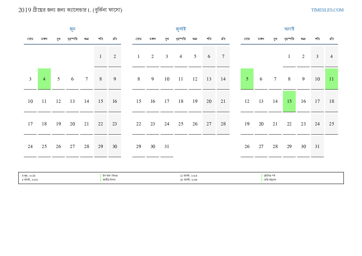 বুর্কিনা ফাসোর জন্য 2019 সালের গ্রীষ্মের জন্য ছুটি এবং সাপ্তাহিক ছুটির সাথে পিডিএফ ক্যালেন্ডার ডাউনলোড এবং মুদ্রণ করুন