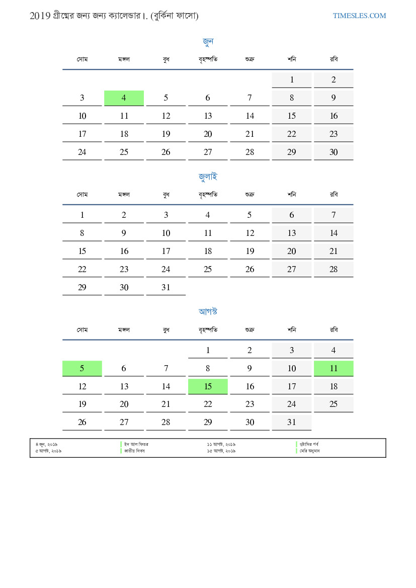 বুর্কিনা ফাসোর জন্য 2019 সালের গ্রীষ্মের জন্য ছুটির দিনগুলি এবং সাপ্তাহিক ছুটির দিনগুলি