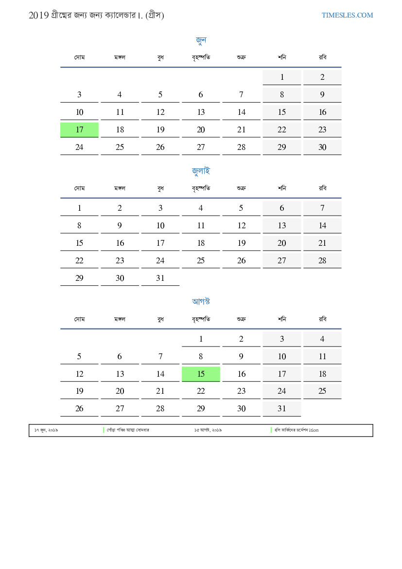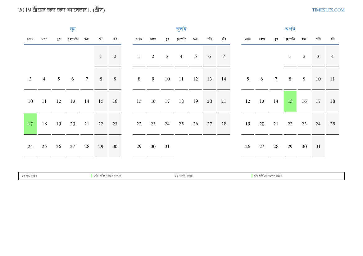 2019 সালের গ্রীষ্মকালে গ্রীকে ৫ ছুটি এবং দিন ছুটি থাকে। গ্রীষ্ম কালীন 2121 শনিবারে শুরু হয়ে শনিবারে শেষ হবে।