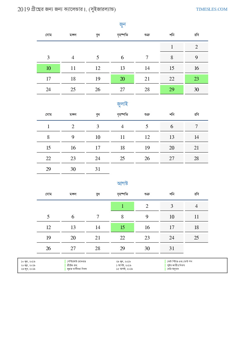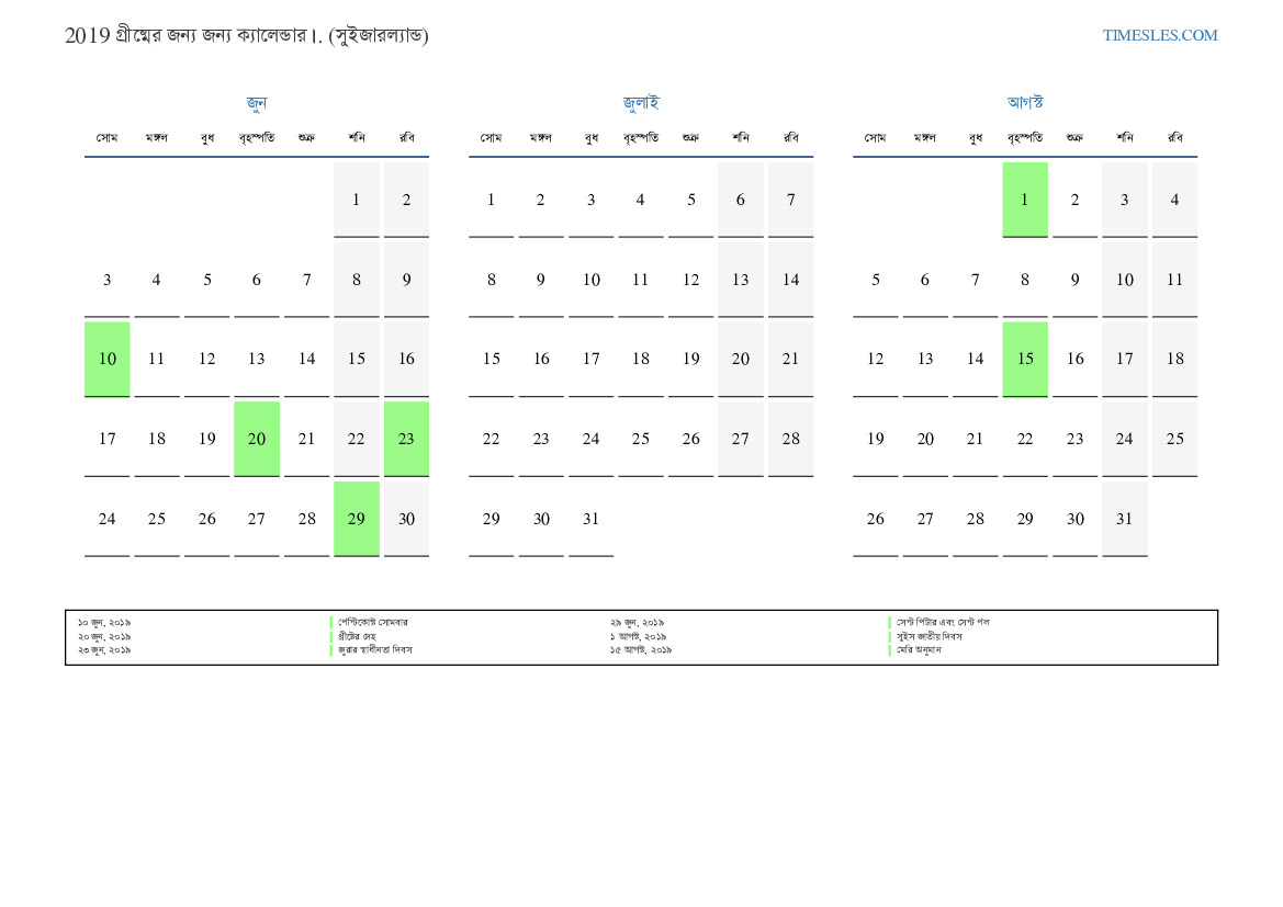 সুইজারল্যান্ডের জন্য 2019 সালের গ্রীষ্মের জন্য ছুটির দিনগুলি এবং সাপ্তাহিক ছুটির দিনগুলি
